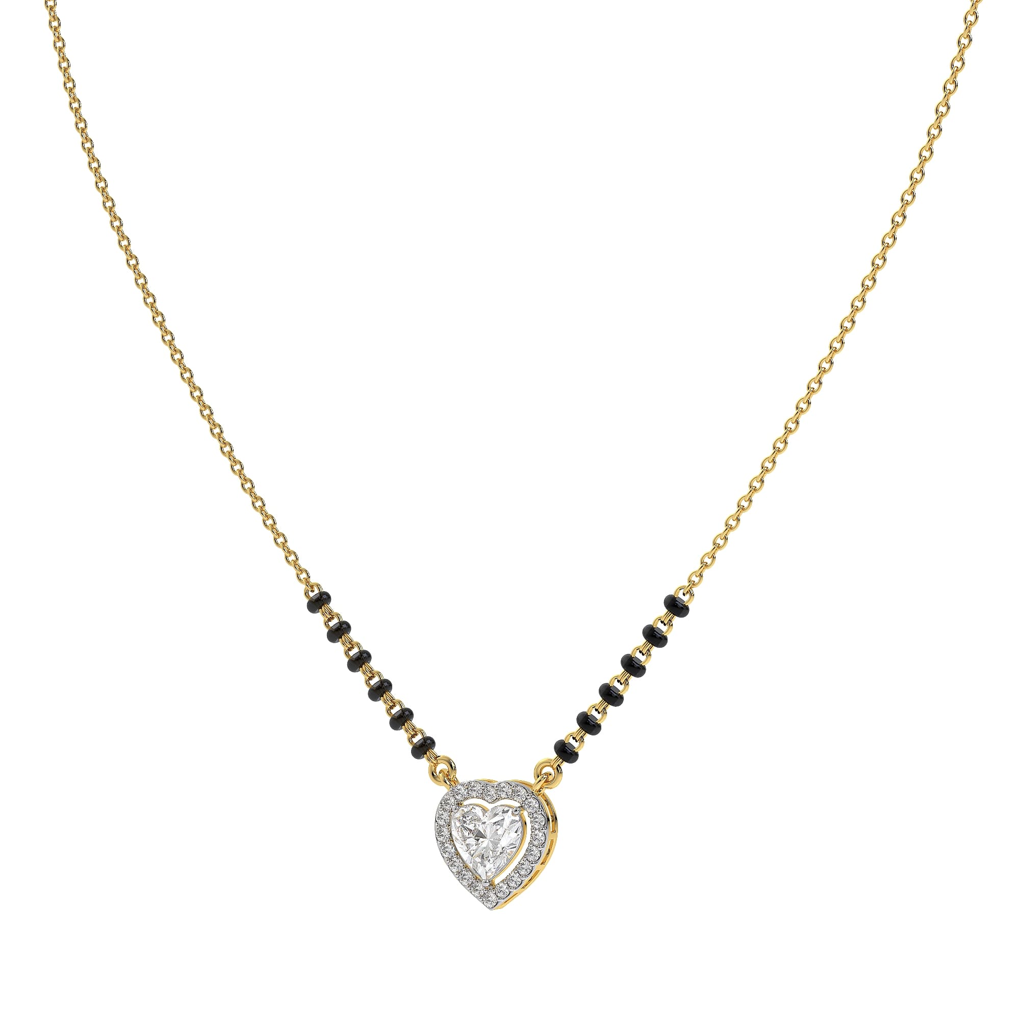 Featuring a romantic heart-shaped diamond at its core, surrounded by a dazzling halo, this mangalsutra symbolises love and devotion with a graceful, elegant design.