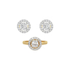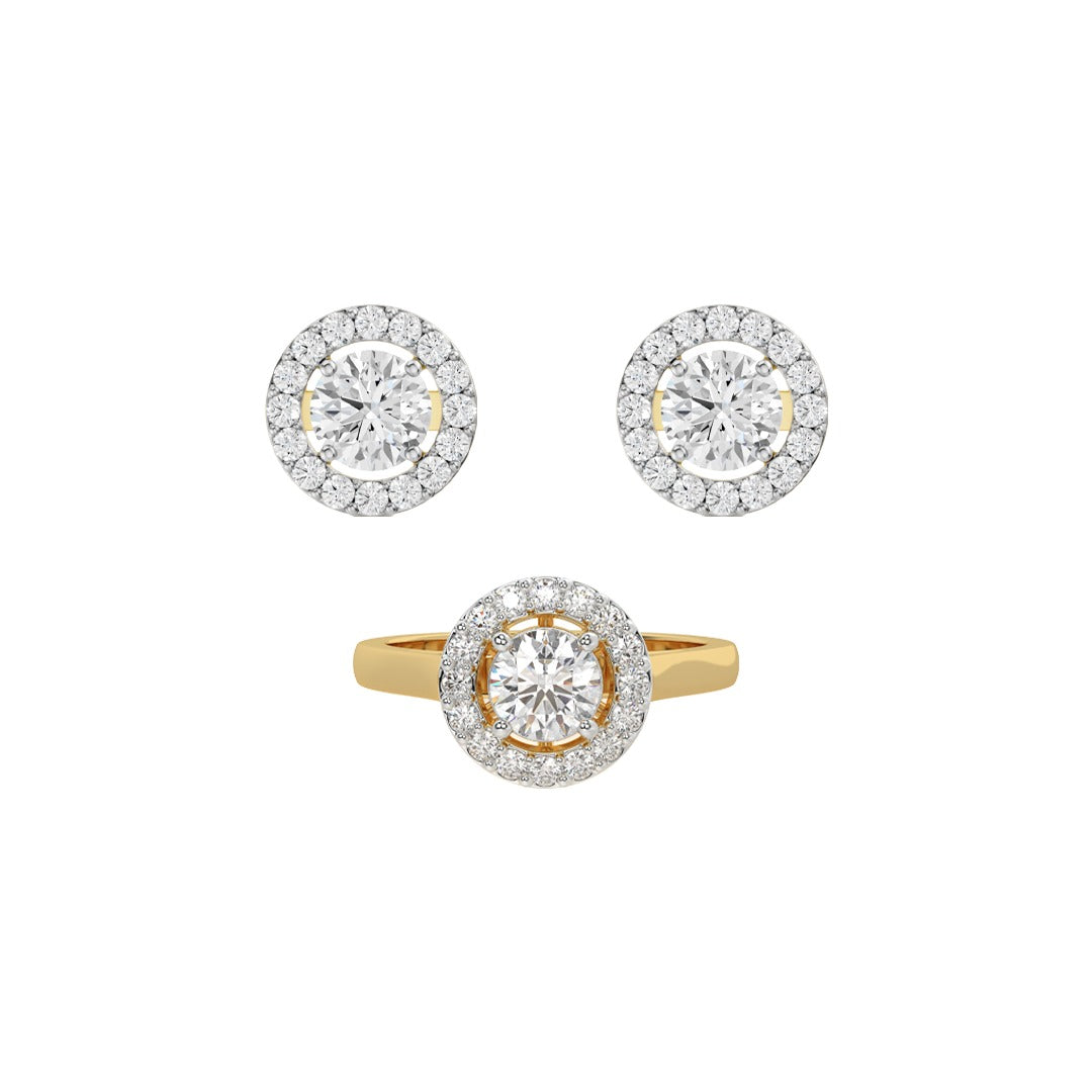 A stunning MYZA Diamond Halo Earrings & Ring Combo Set, showcasing an IGI-certified lab-grown diamond set in 18K hallmarked yellow gold, embodying timeless elegance with its sleek design.
