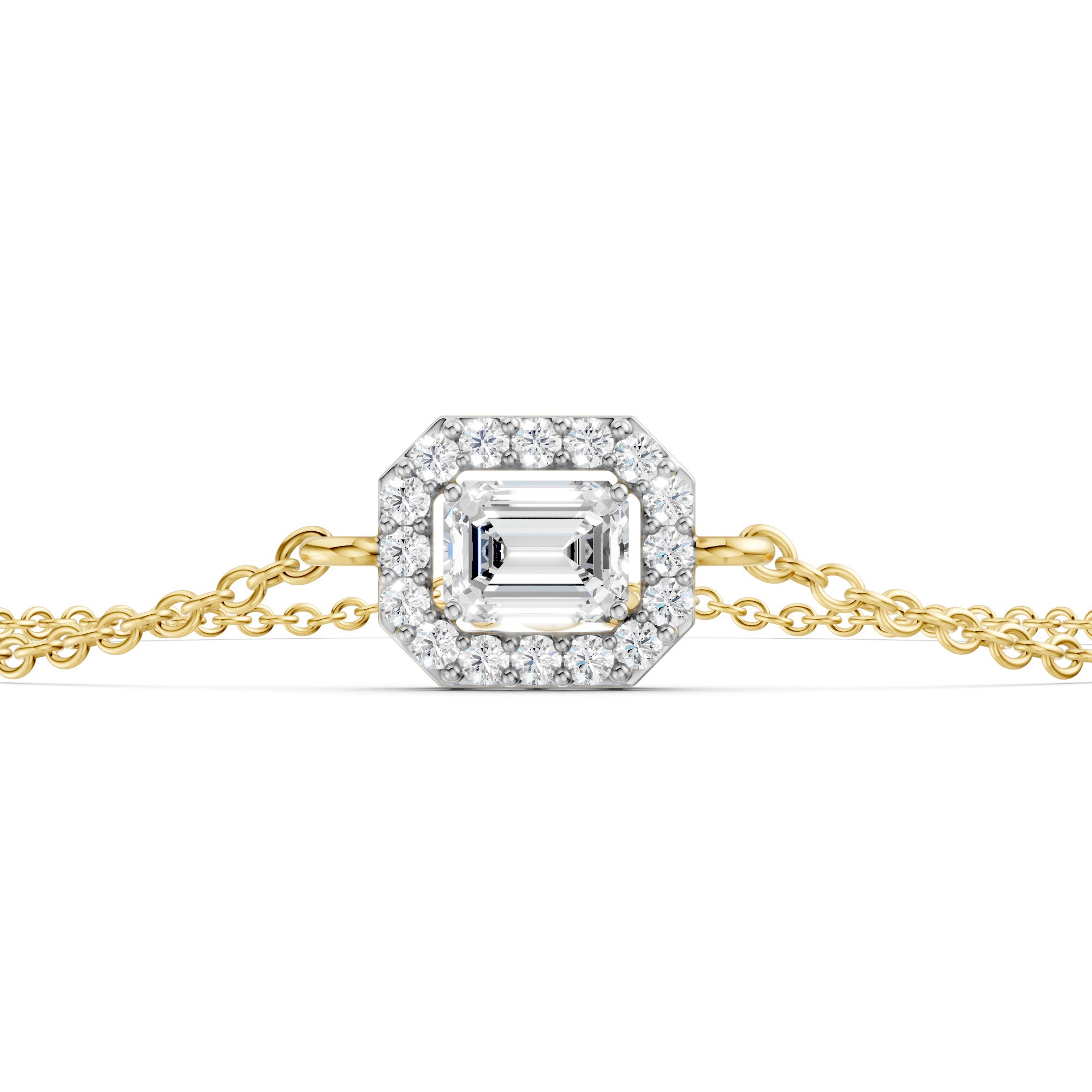 Featuring the timeless MYZA 0.50 Carat IGI Certified Lab Grown Emerald Cut Diamond Halo Bracelet in 18K Hallmark Gold