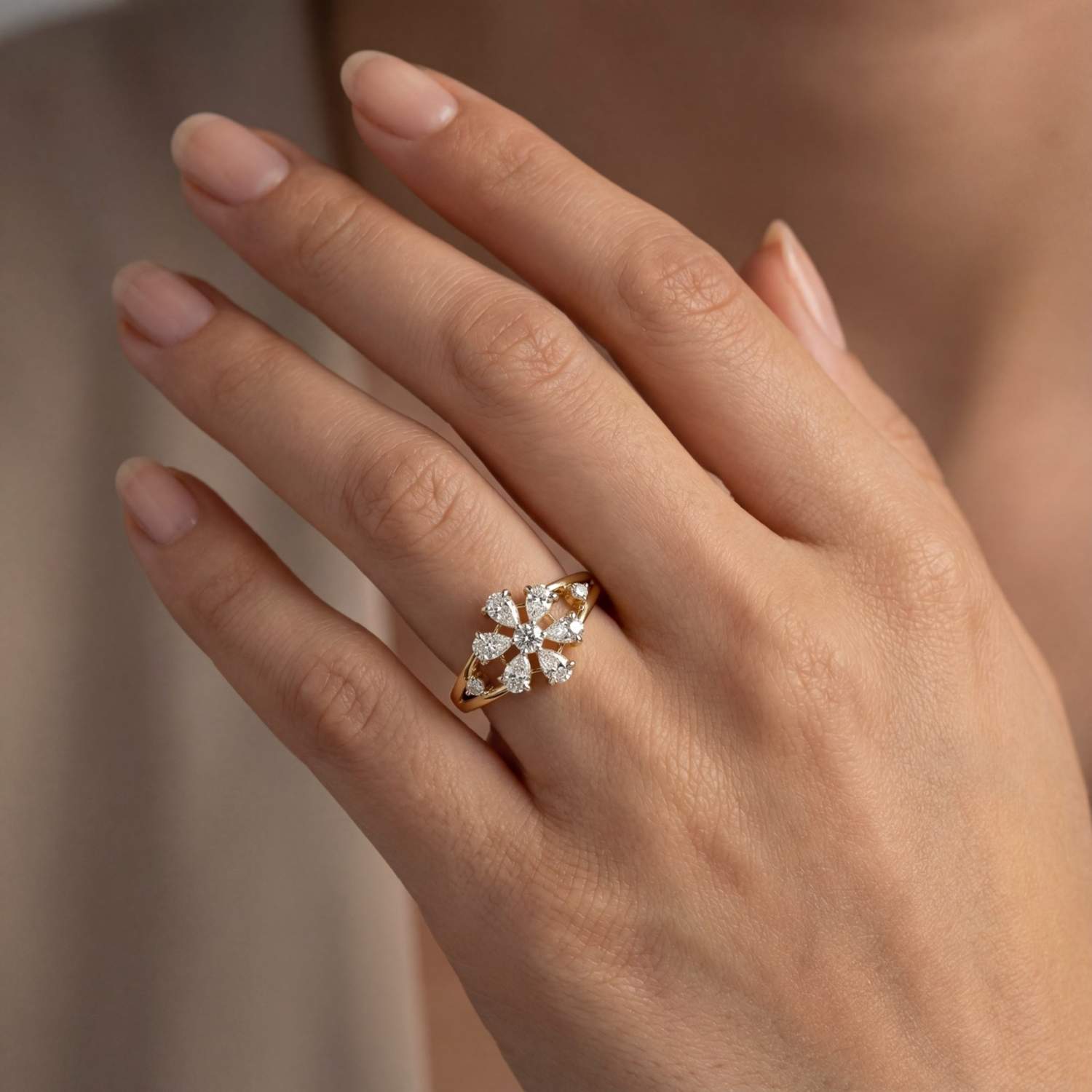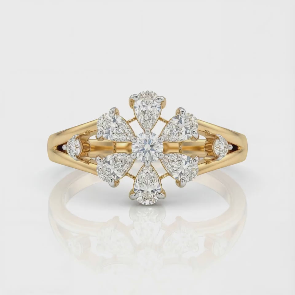 0.82 MYZA Certified (D/VVS2) Lab-Grown Round with Pear Diamond Daisy Flower Ring in 18K Hallmarked Gold