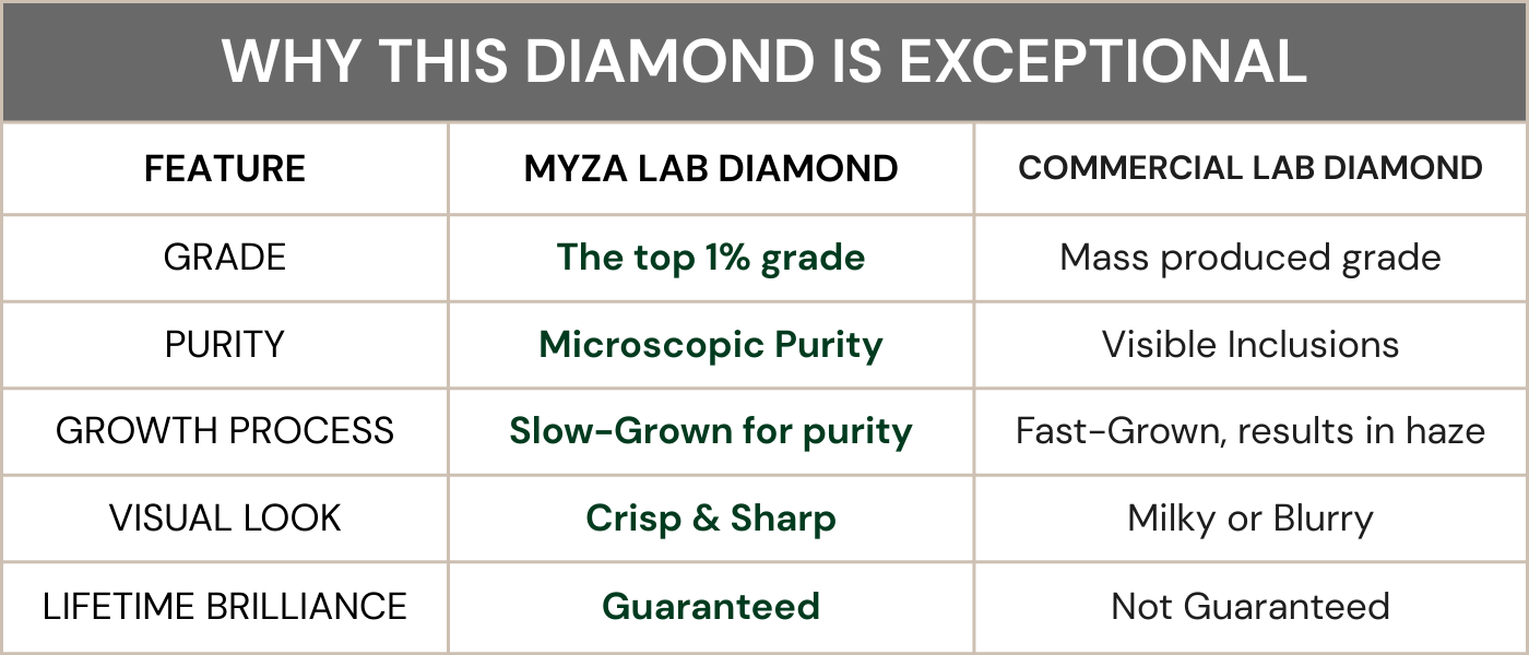 - MYZA Certified Lab-Grown Diamonds — Ethically sourced, environmentally responsible, and chemically identical to mined diamonds