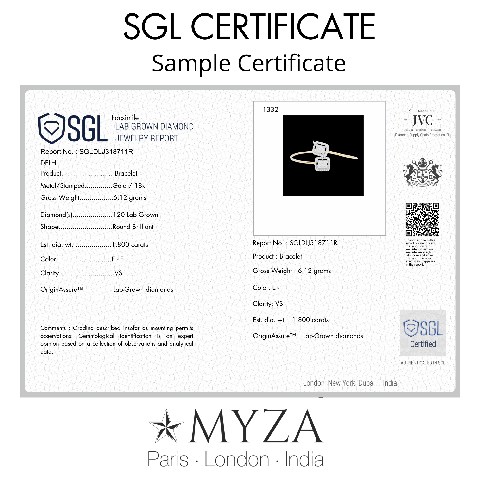 Wrap your wrist in brilliance. The MYZA Certified 1.8 Carat Lab-Grown Round Brilliant Cut Diamond Bracelet is crafted in 18K Hallmarked Gold — a flexible, fluid design that moves with you, catching light with every gesture. Each diamond is ethically grown, conflict-free, and certified for quality you can trust.