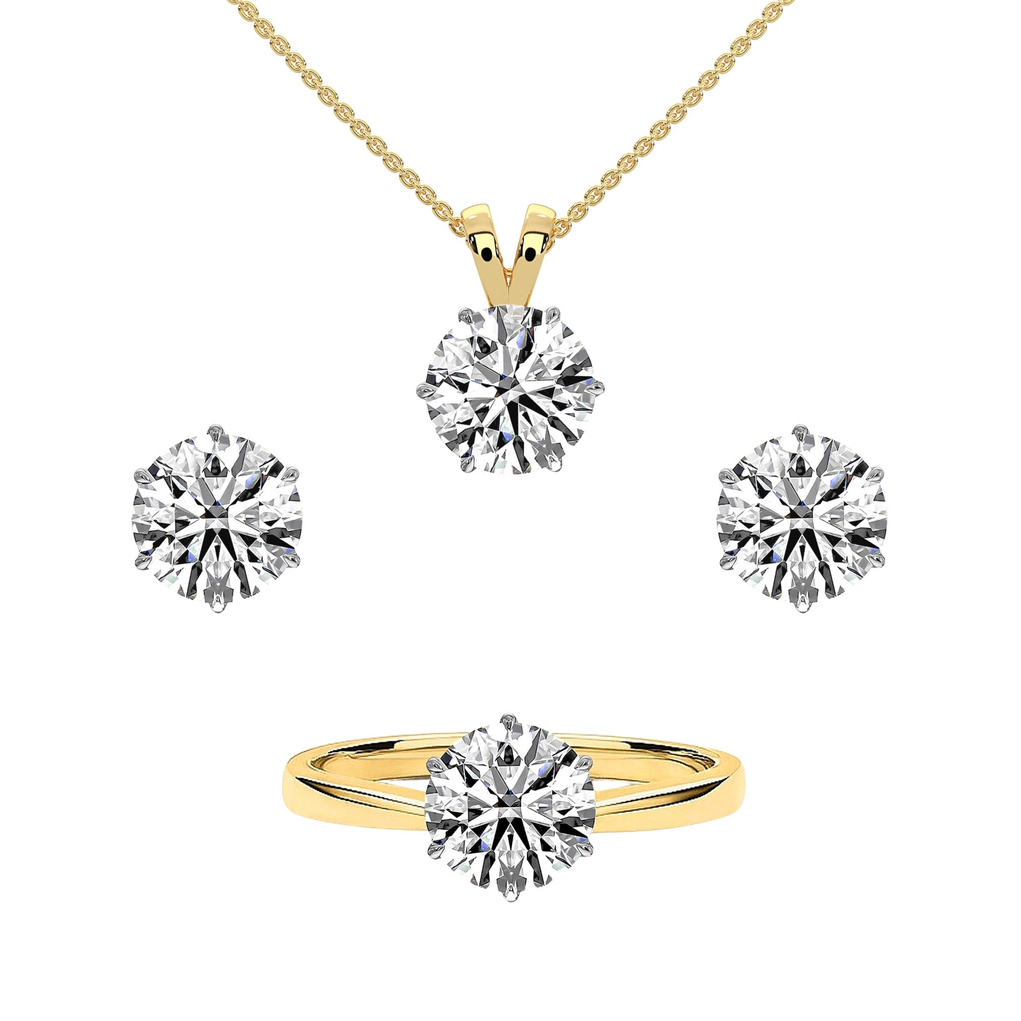 A stunning MYZA Necklace, Ring & Earrings Set, showcasing an IGI-certified lab-grown diamond set in 18K hallmarked yellow gold, embodying timeless elegance with its sleek design.