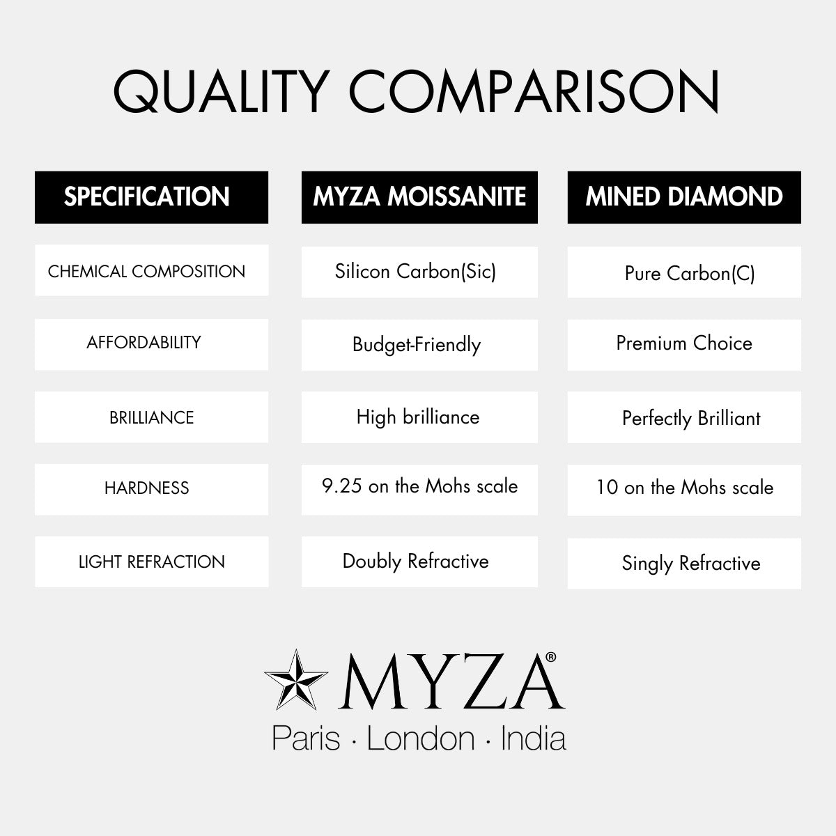 | *DEW: Diamond Equivalent Weight. Myza weighs approximately 10% less than a diamond of the same diameter. We use a Diamond Equivalent Weight (DEW) to give customers a comparative estimate of gemstone size. | |