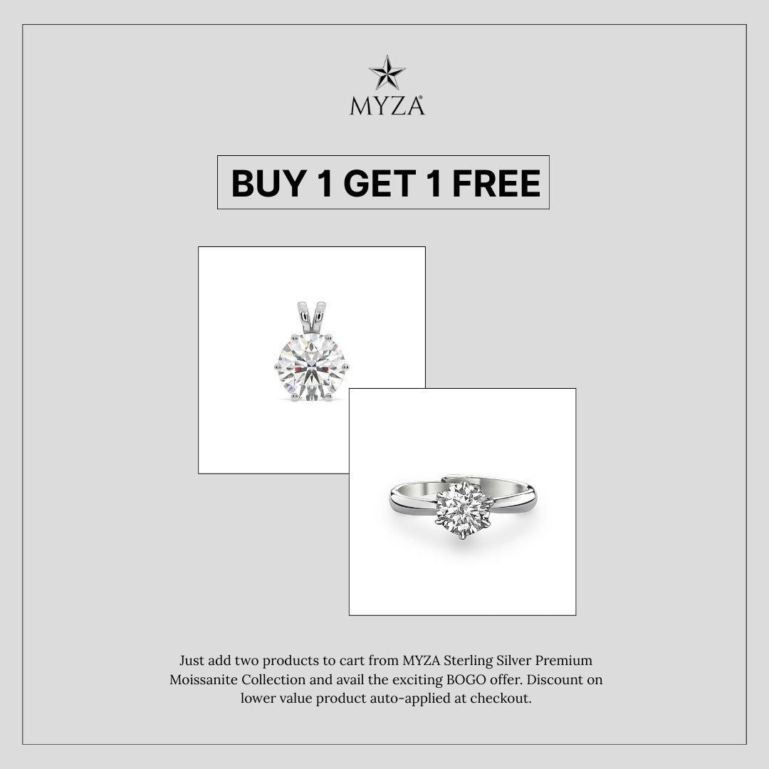 Just add two products to cart from MYZA Sterling Silver Premium Moissanite Collection and avail BOGO offer. Discount on lower value product auto applied at checkout.