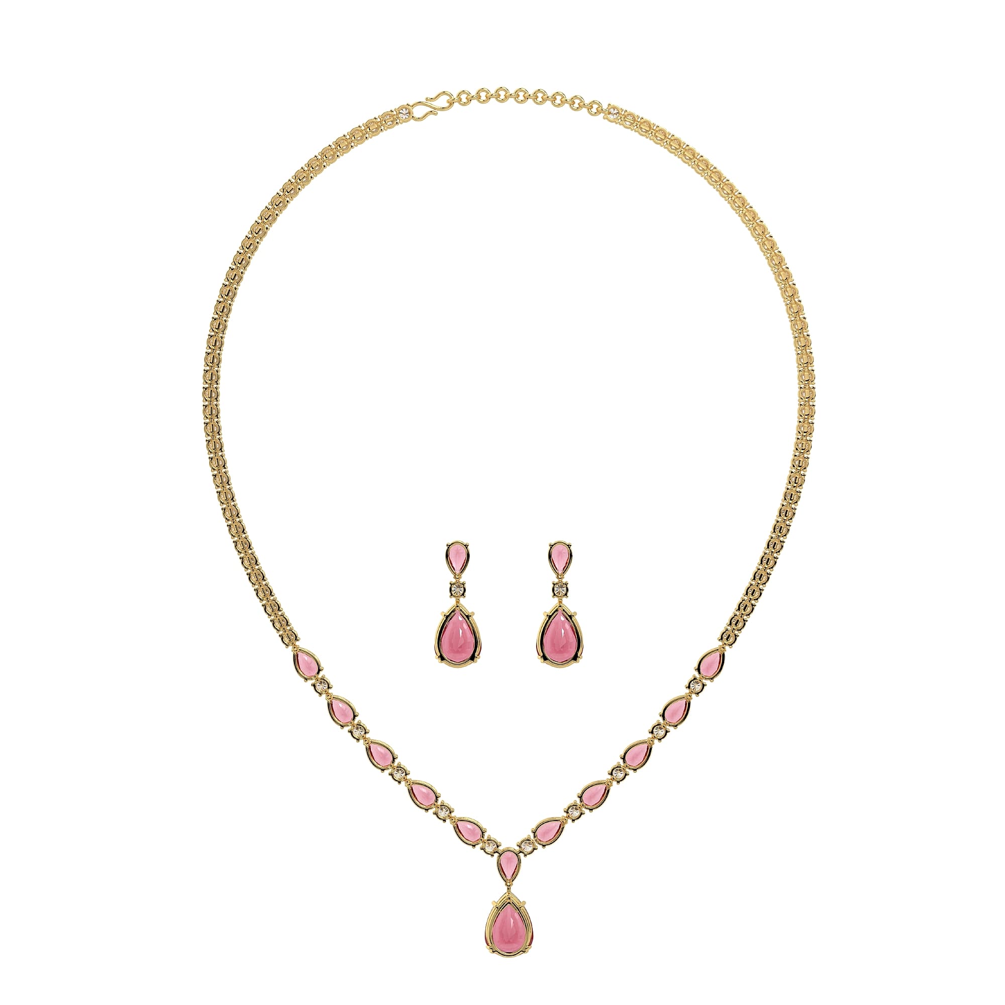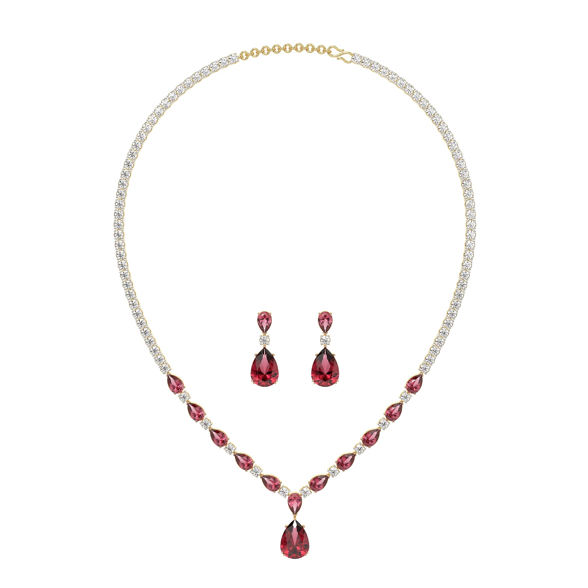 A stunning MYZA Pear Cut Ruby Gemstone and Round Diamond Necklace & Earrings Set, showcasing an IGI-certified lab-grown diamond set in 18K hallmarked yellow gold, embodying timeless elegance with its sleek design.
