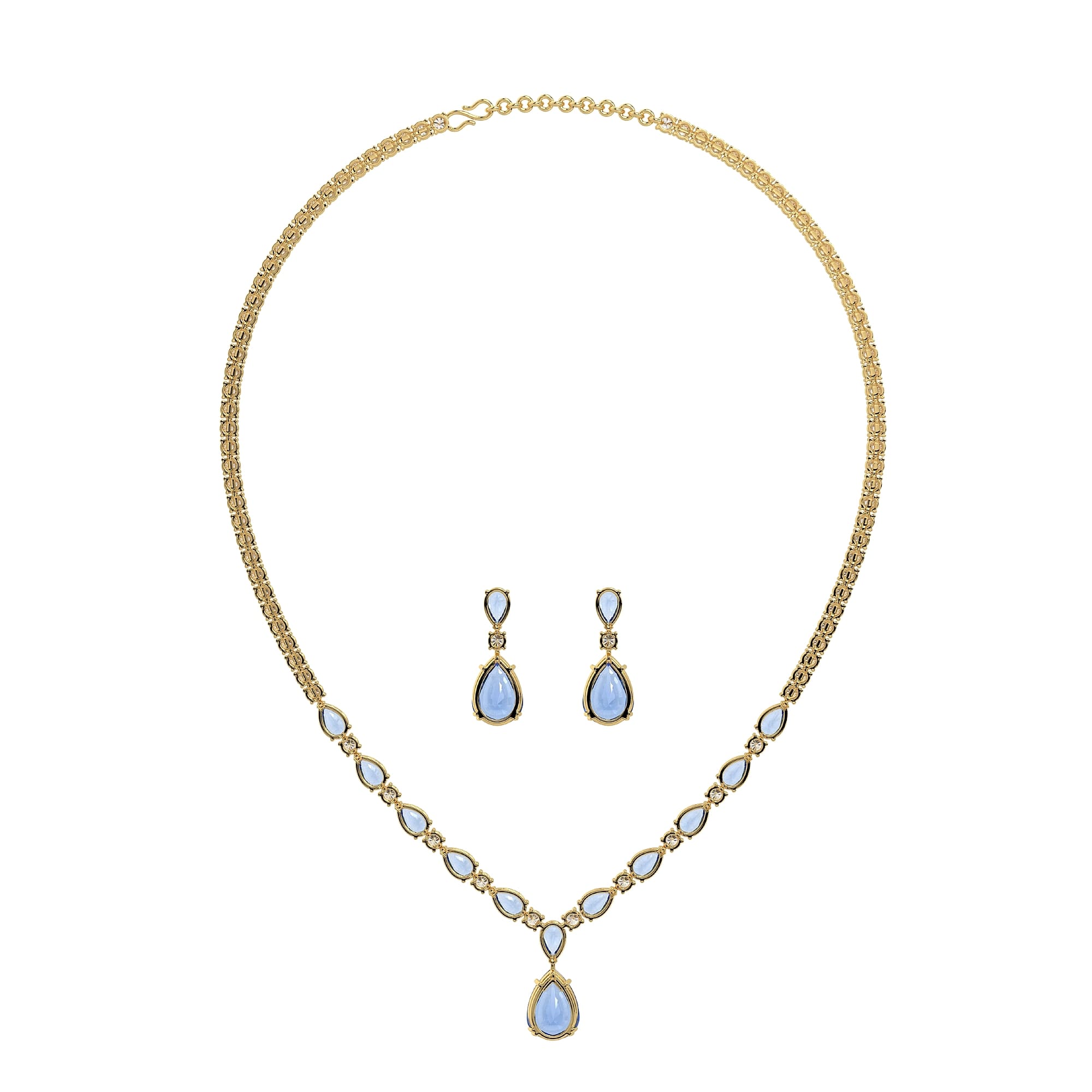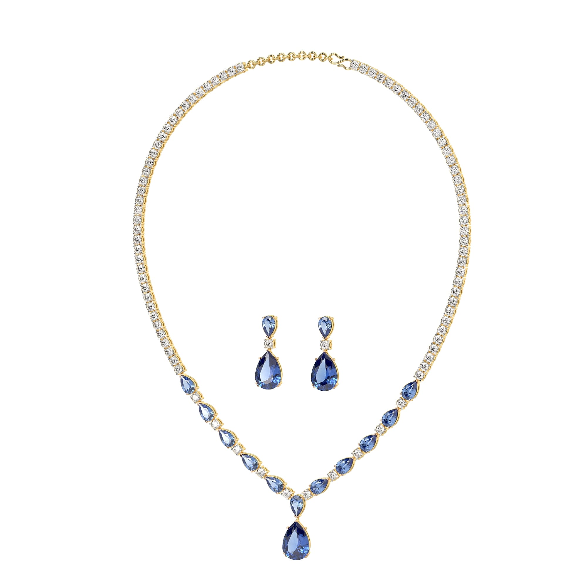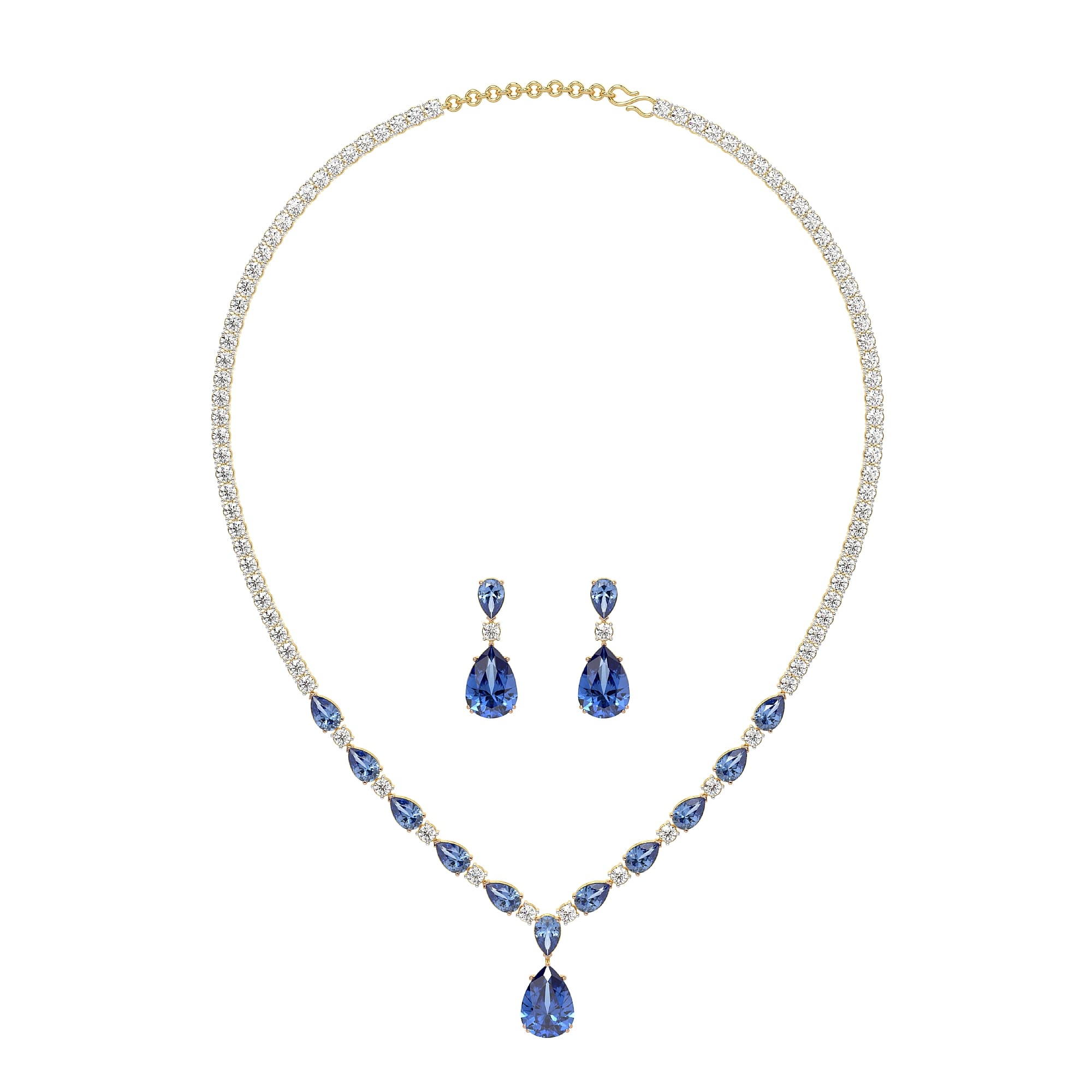 MYZA IGI-Certified Pear Cut Sapphire Gemstone and Round Diamond Necklace with Earrings Set in 18K Hallmarked Gold