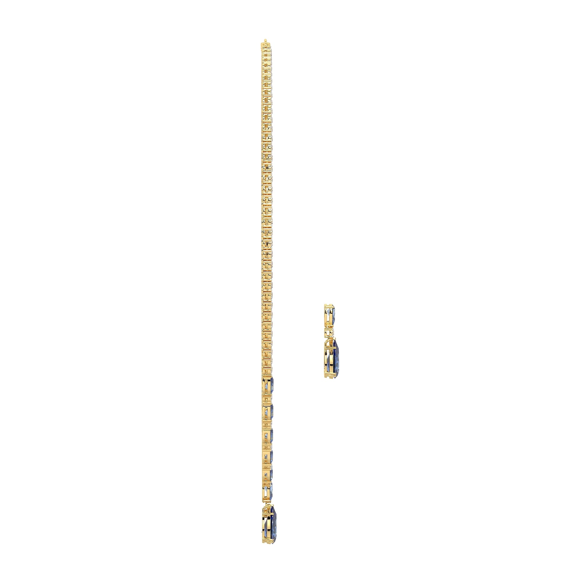 A stunning MYZA Pear Cut Sapphire Gemstone and Round Diamond Necklace & Earrings Set, showcasing an IGI-certified lab-grown diamond set in 18K hallmarked yellow gold, embodying timeless elegance with its sleek design.