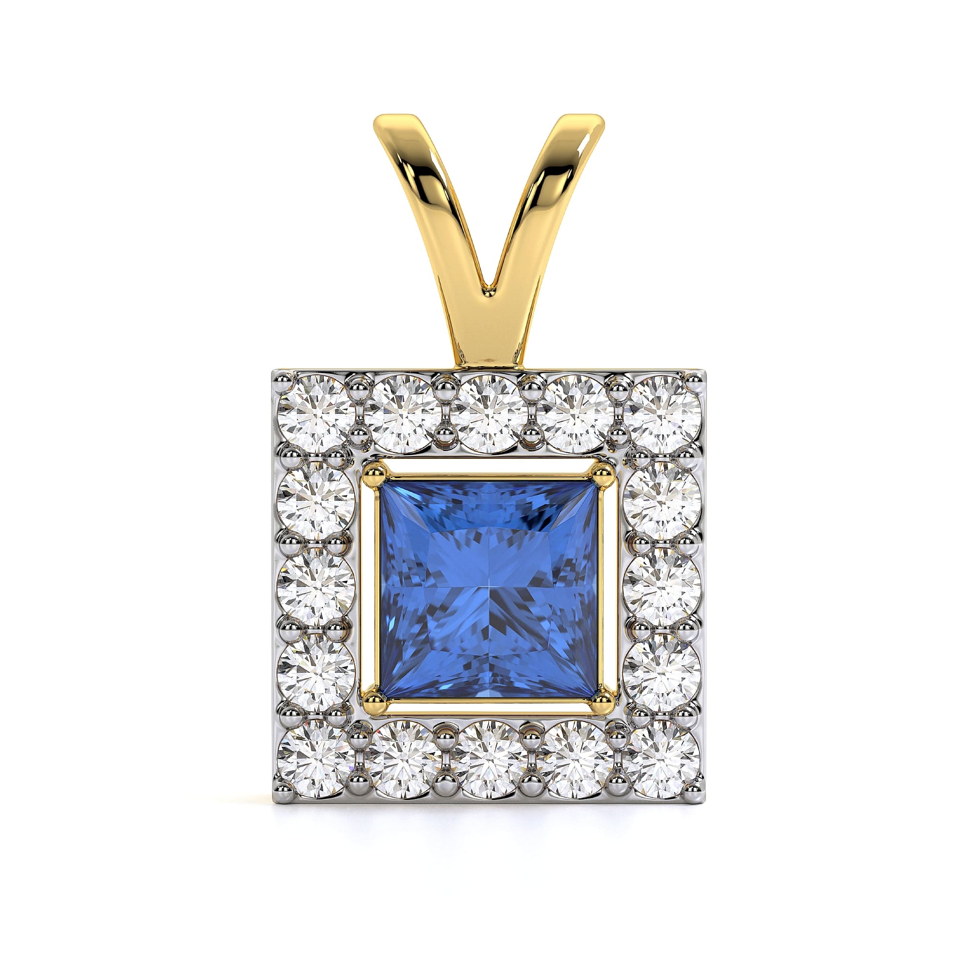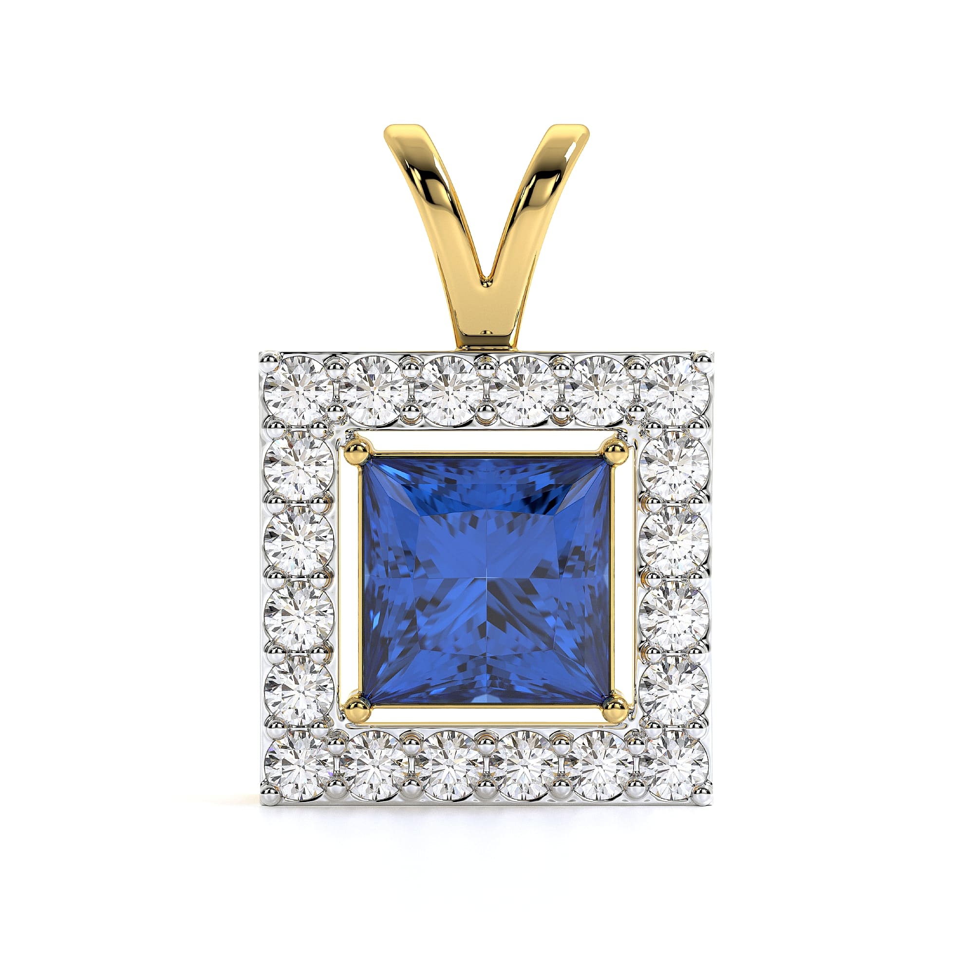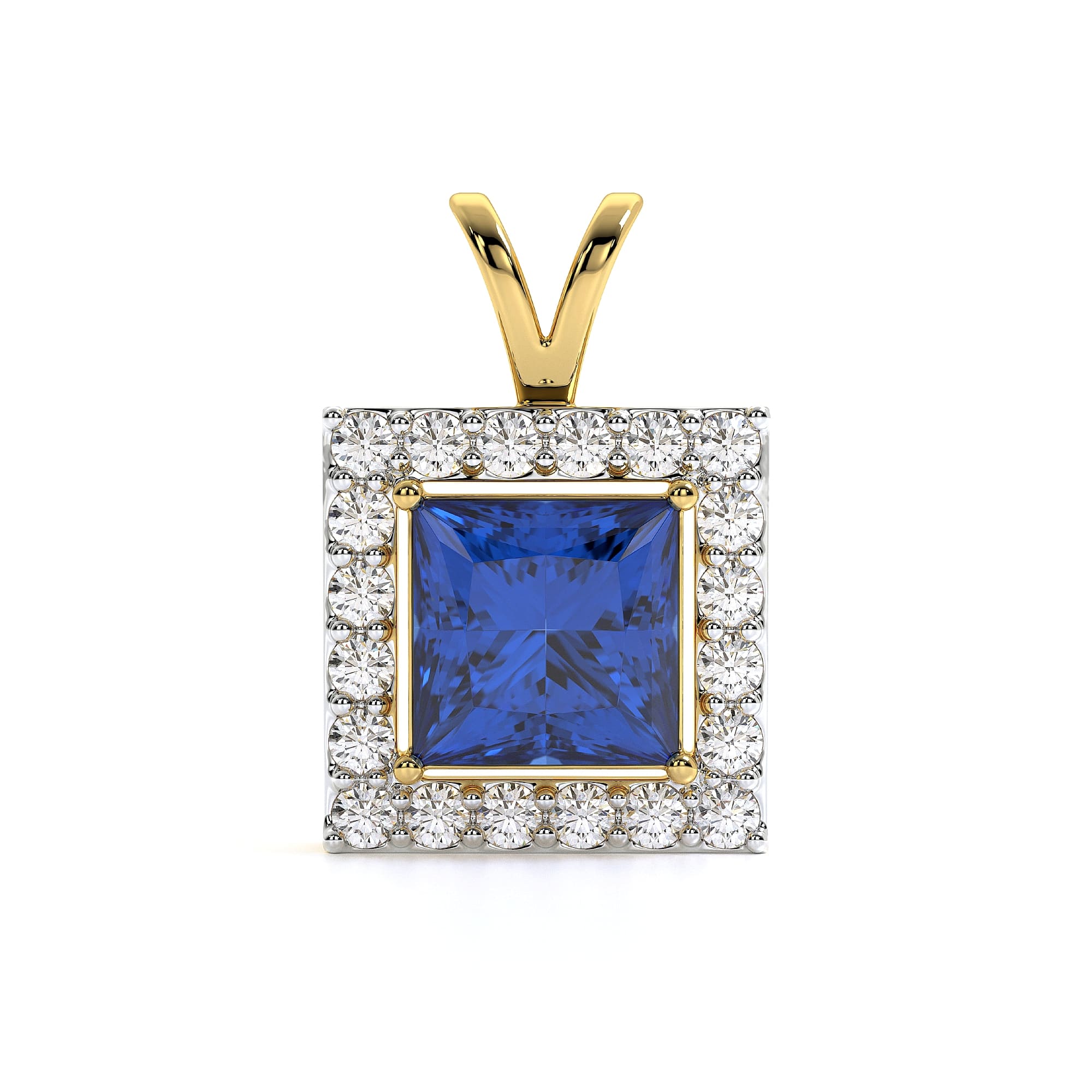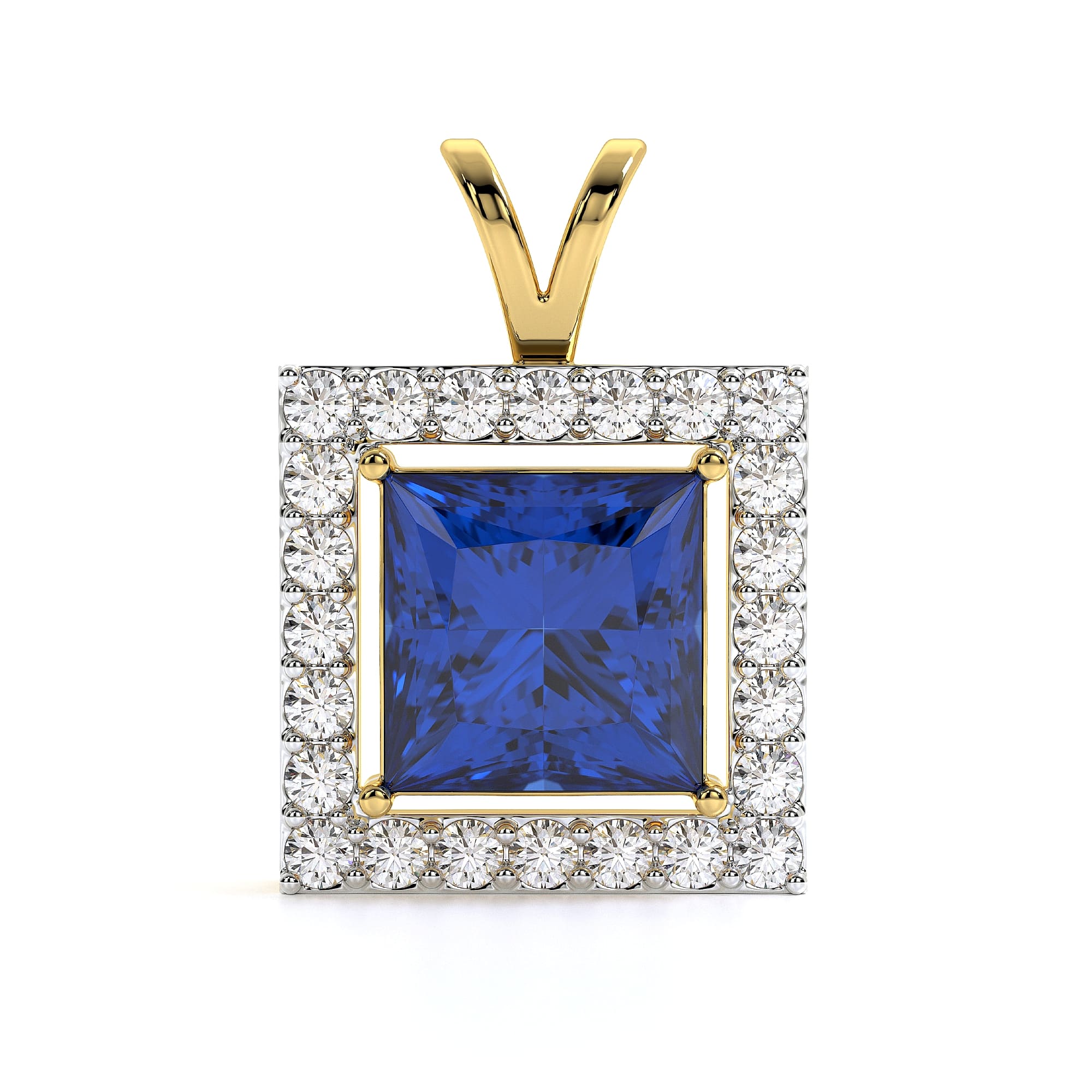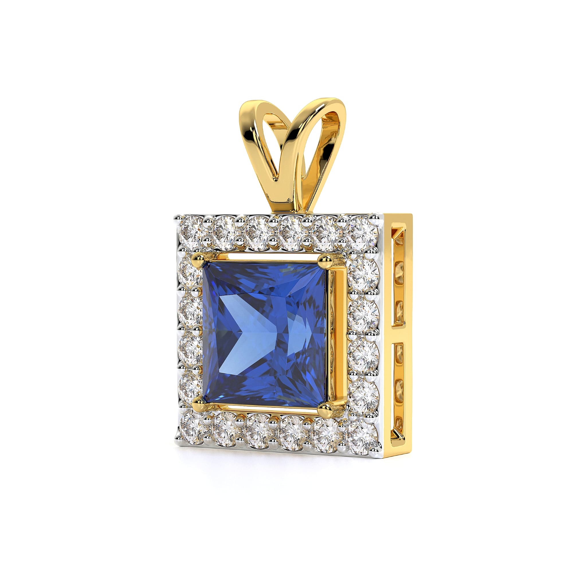 This MYZA Pendant features a radiant Princess Cut Lab-Grown Sapphire Gemstone Halo Pendant, IGI-certified, crafted in 18K hallmarked gold, designed to shine effortlessly.