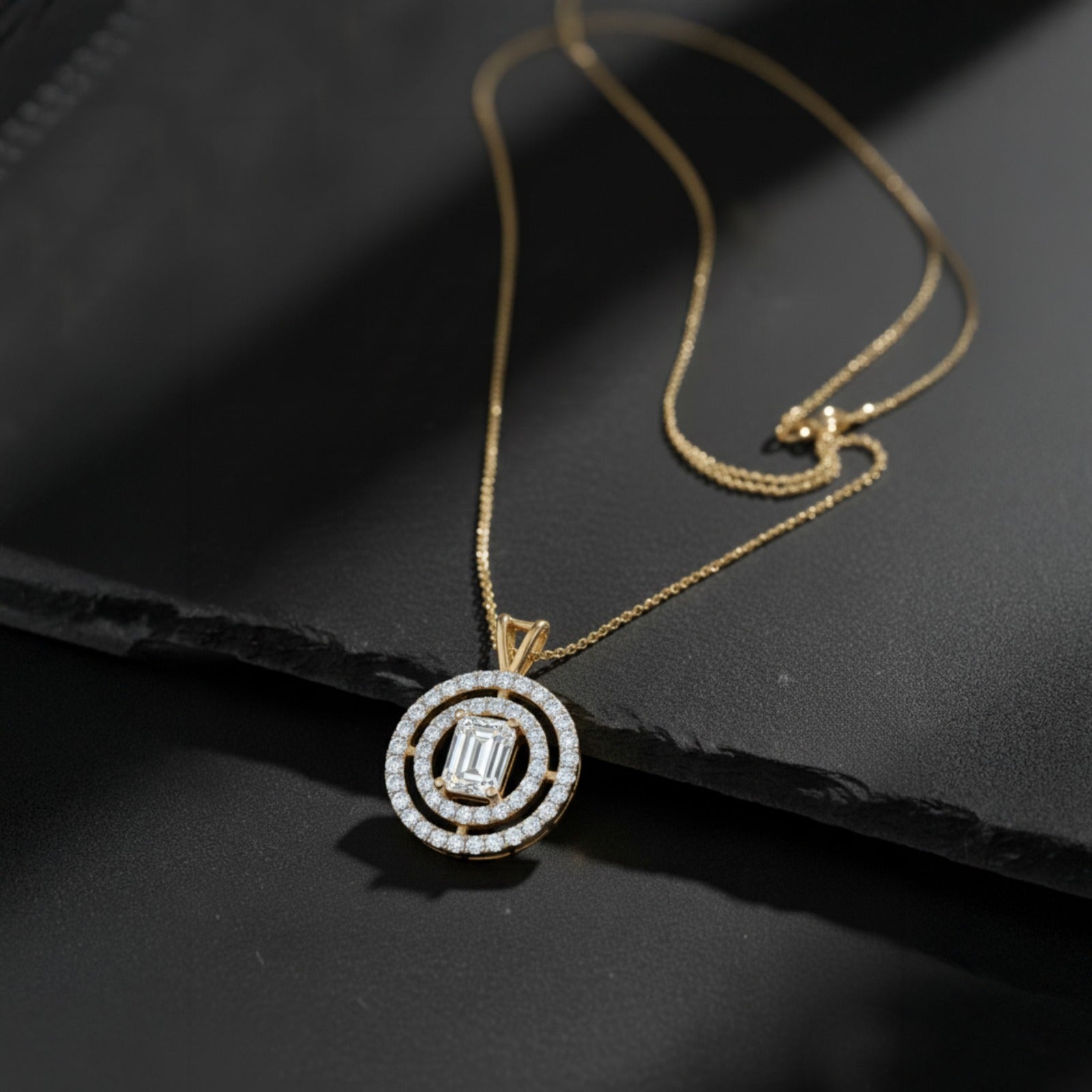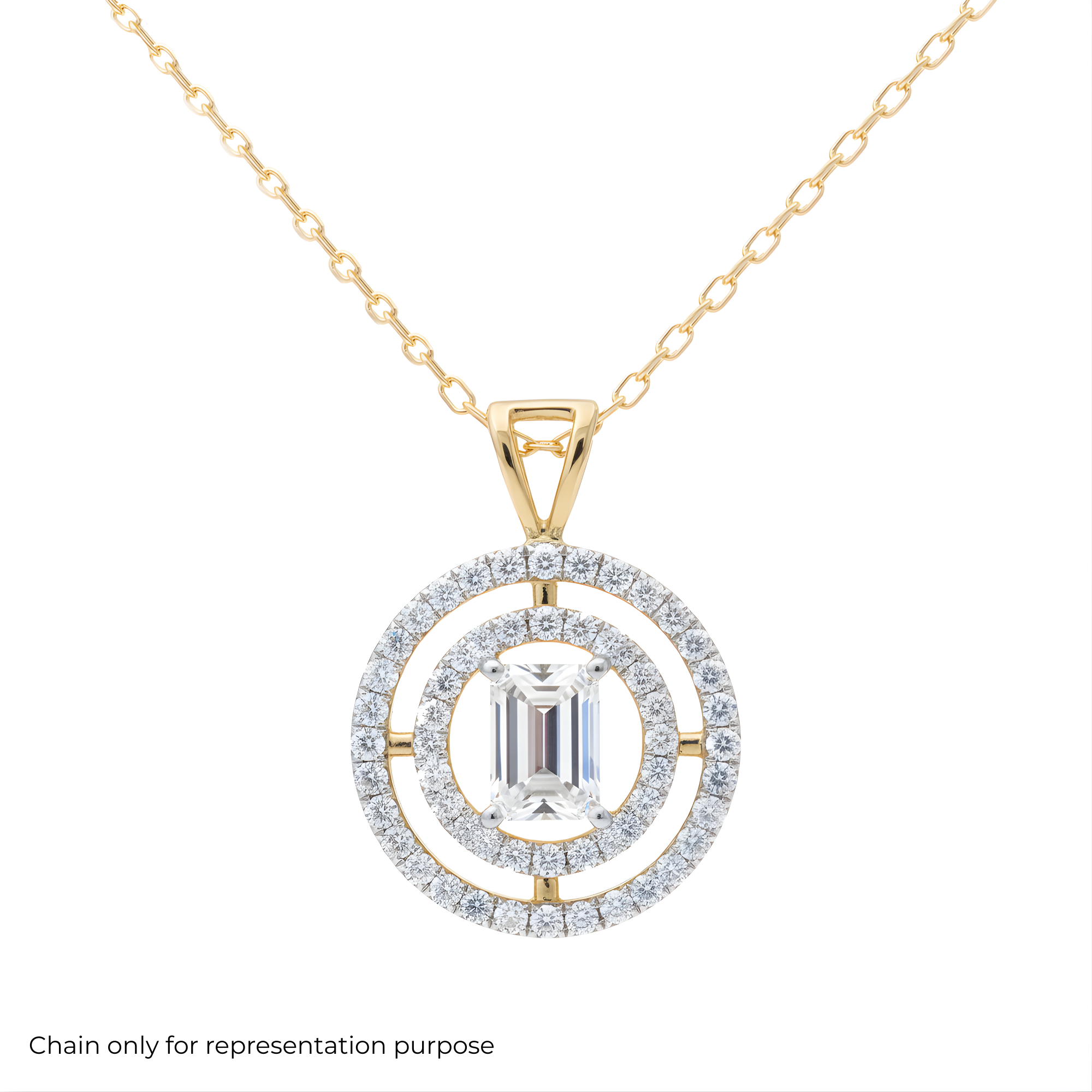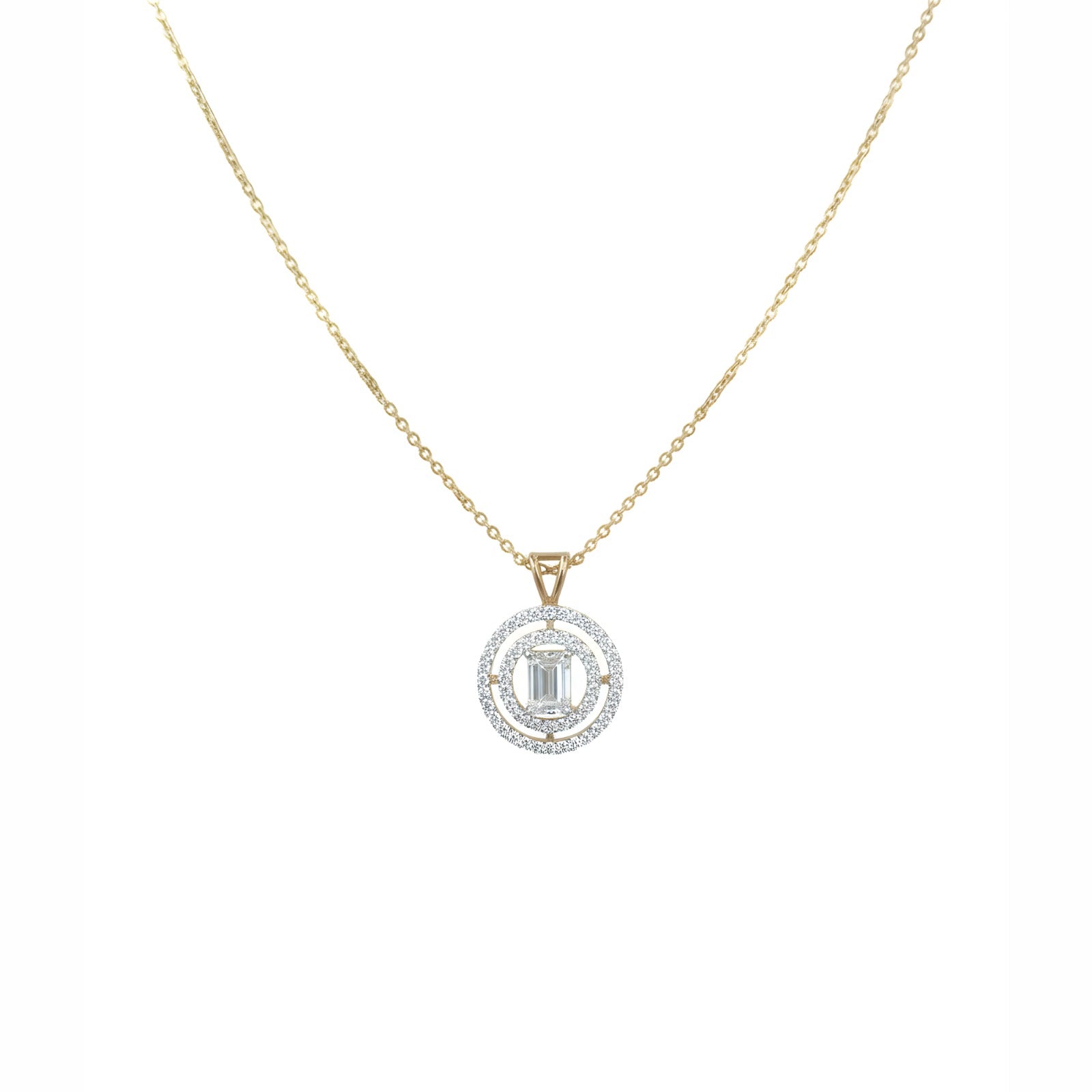 This dazzling MYZA pendant showcases an igi certified (D/VVS2) lab-grown Emerald diamond elegantly set in premium 18K hallmarked gold, radiating timeless beauty.
