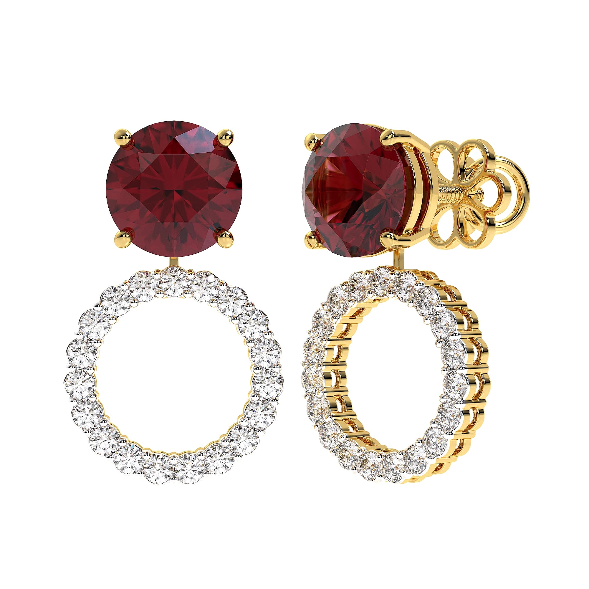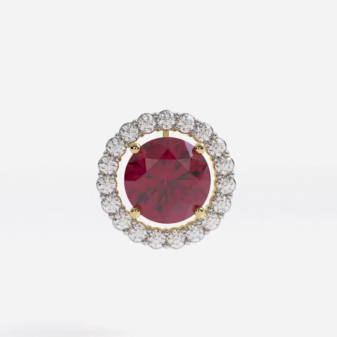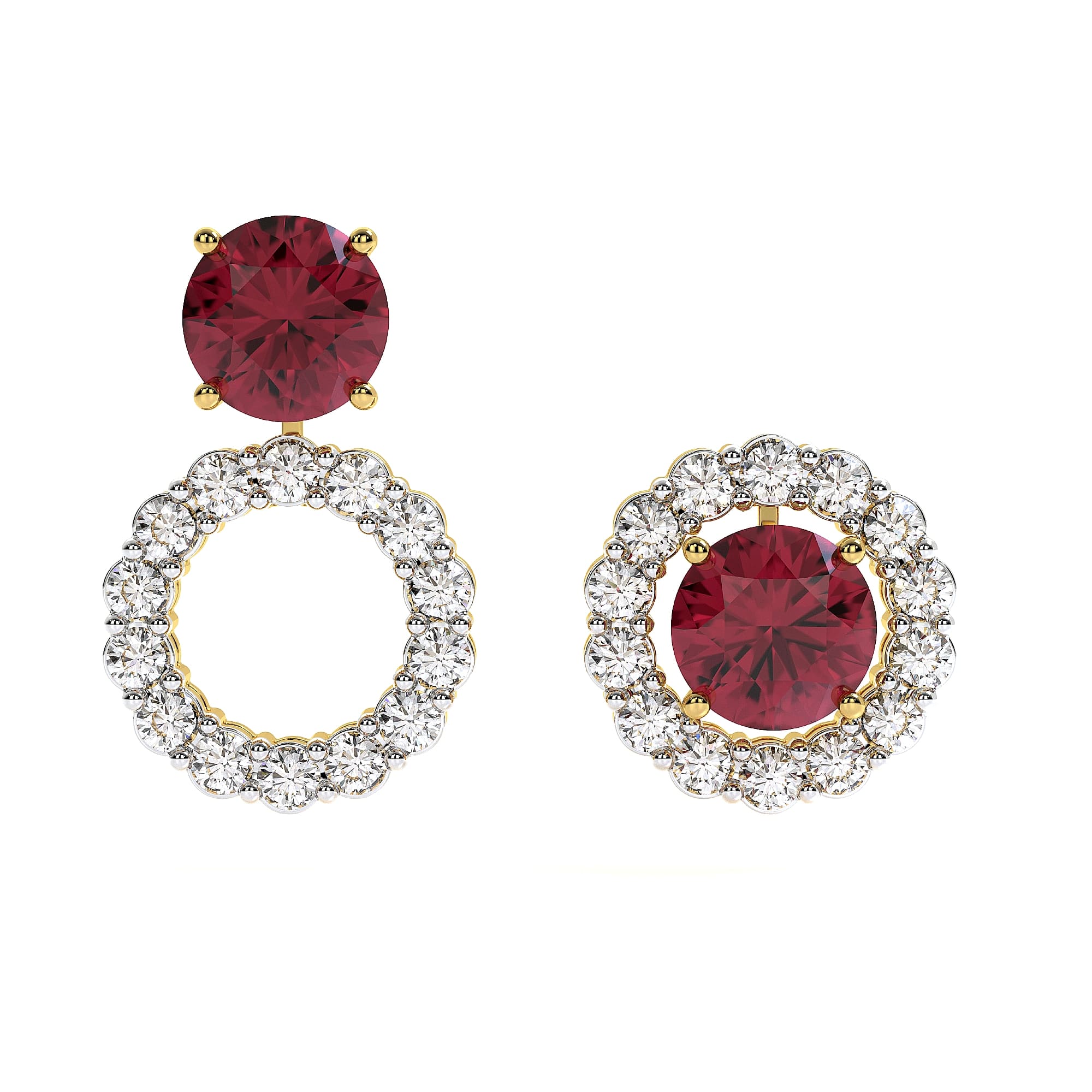 Featuring the timeless MYZA Convertible Round Shape Lab Grown Ruby Gemstone & Diamond Earrings with IGI-certified, lab-grown diamonds, elegantly designed in 18K hallmark yellow gold.