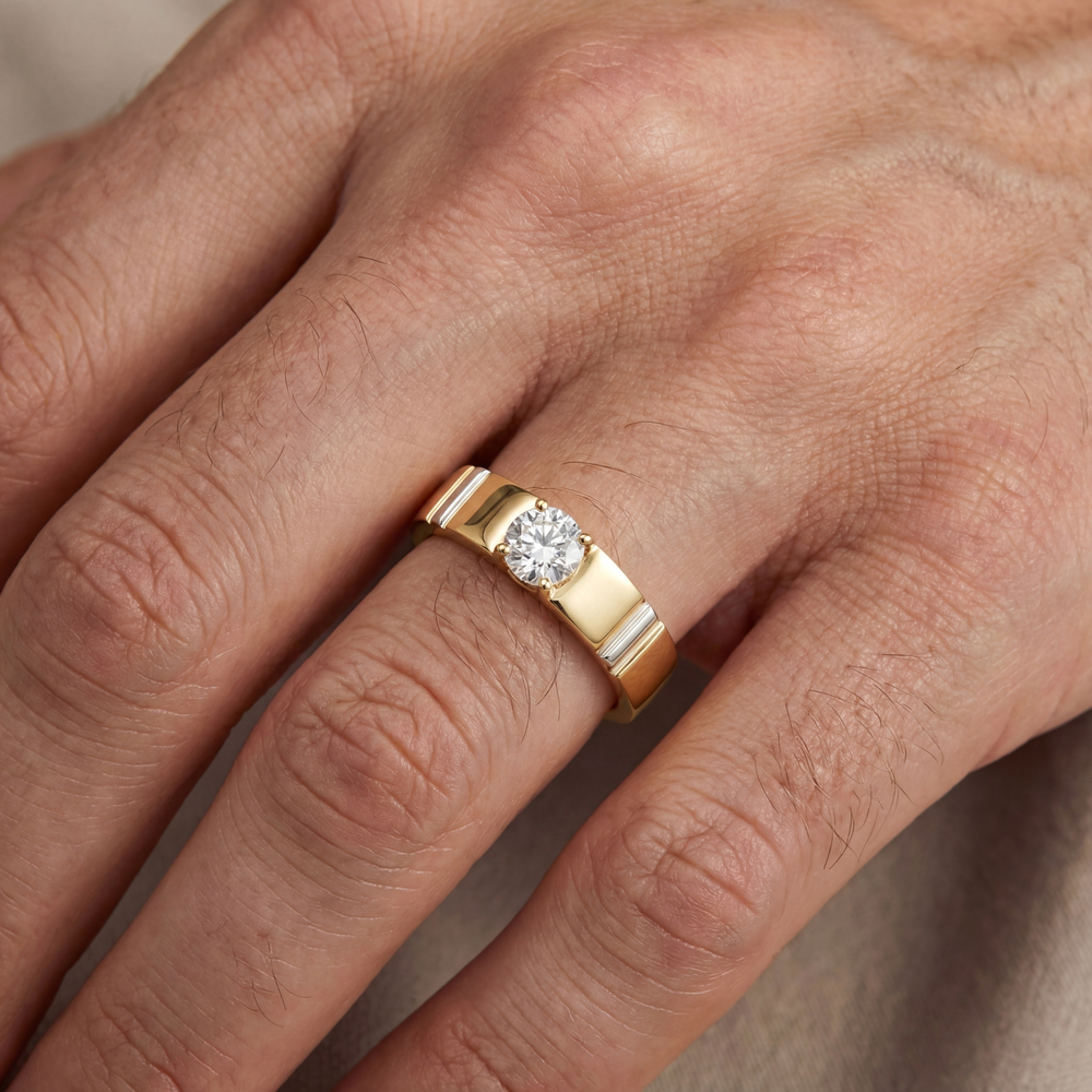 - Men who want a signature Men's Diamond Ring, blending architectural gold detailing with a top-tier IGI Certified D/VVS2 diamond for a unique, everyday statement.
