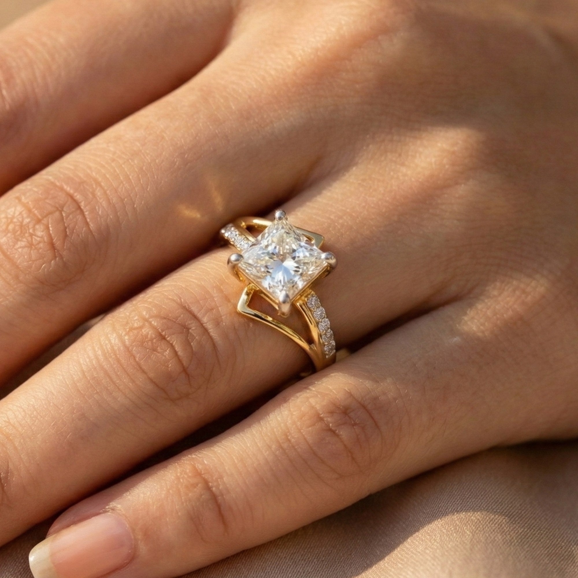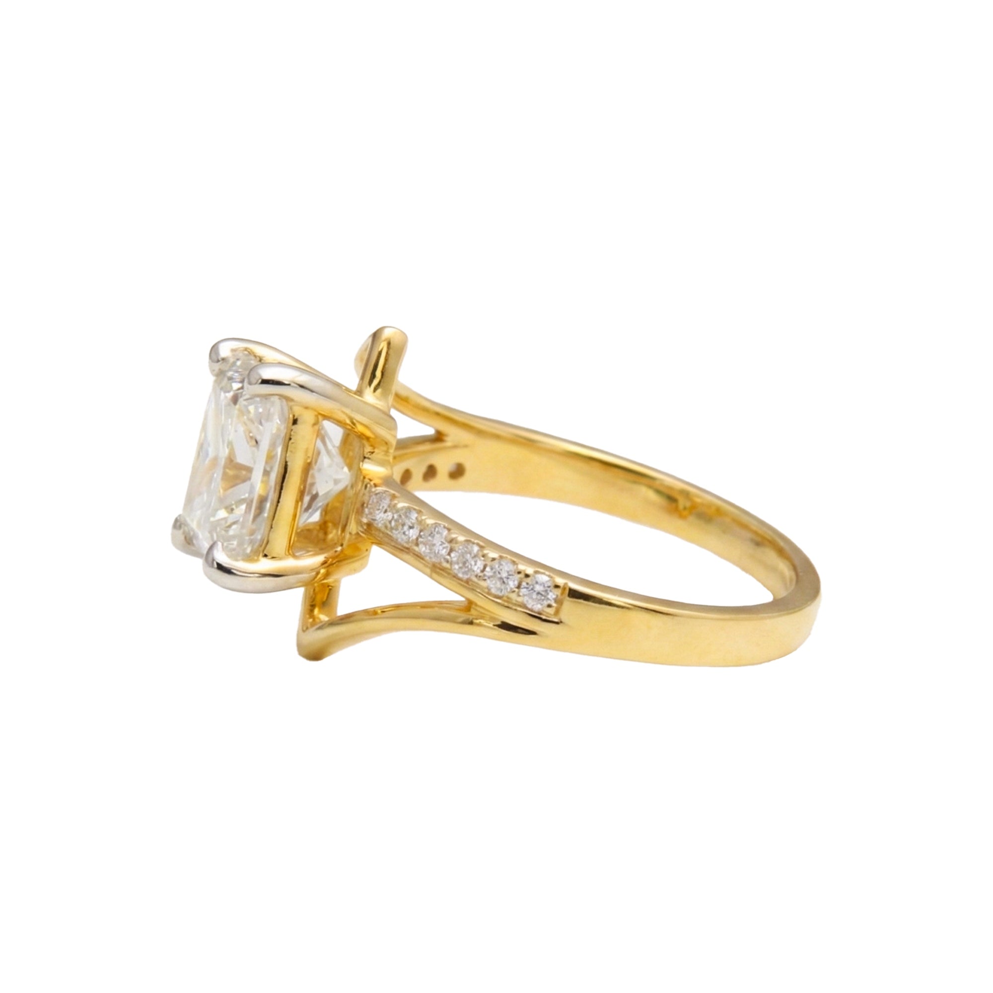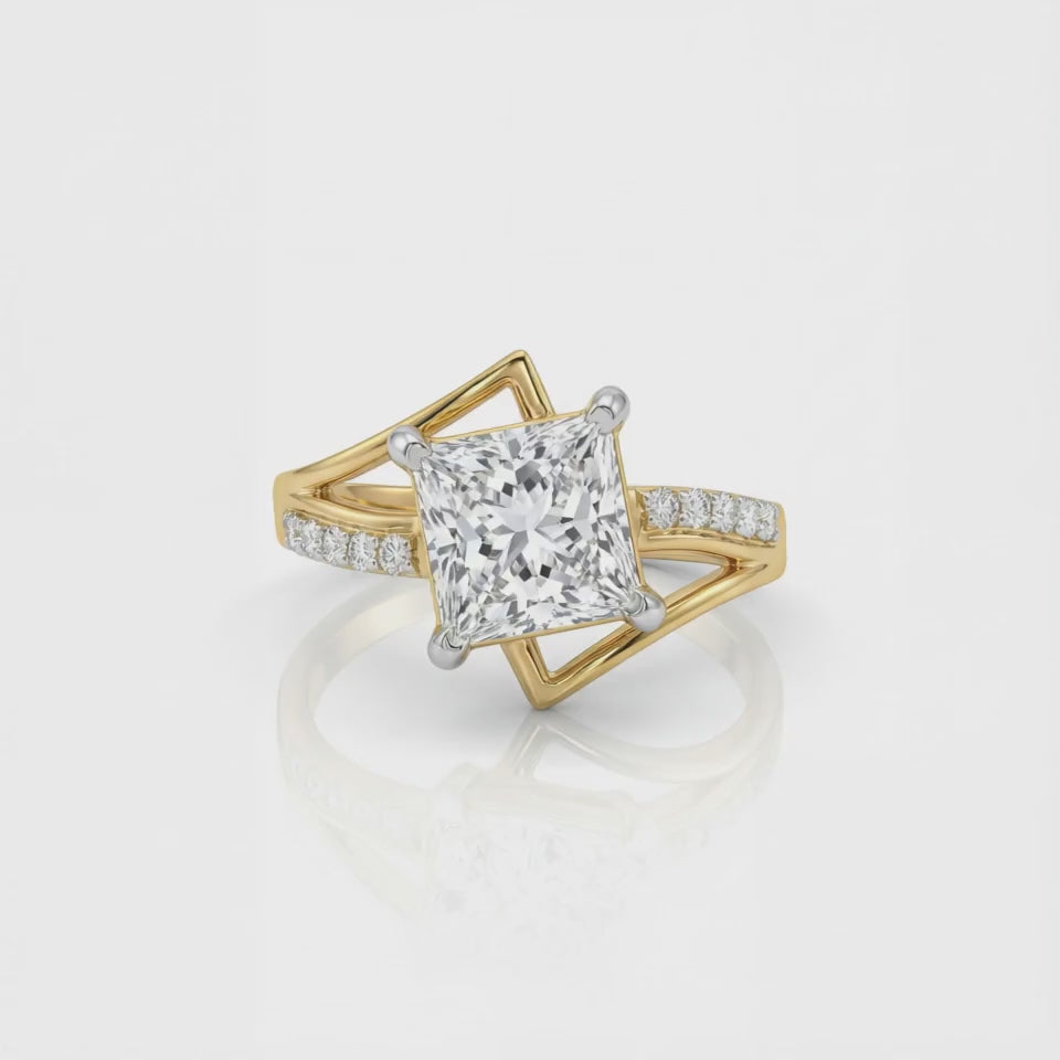 3.15 Carats MYZA IGI Certified (D/VVS2) Lab-Grown Princess Cut with Round Diamond Asymmetrical Pattern Ring in 18K Hallmarked Gold