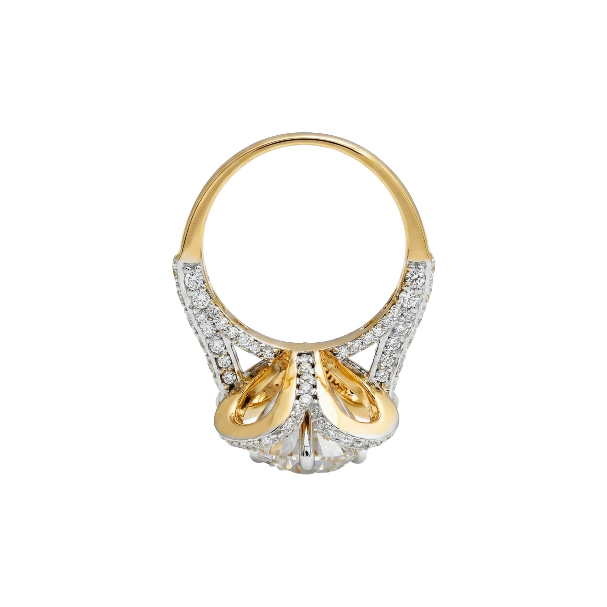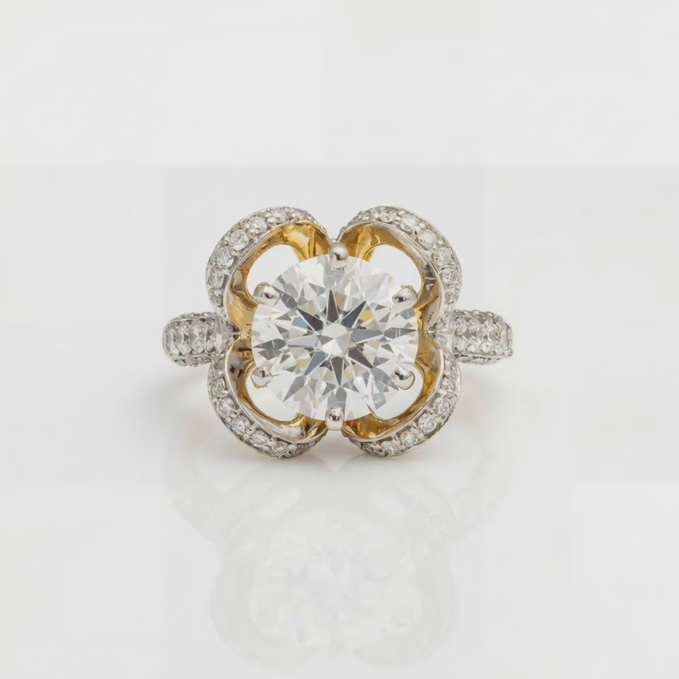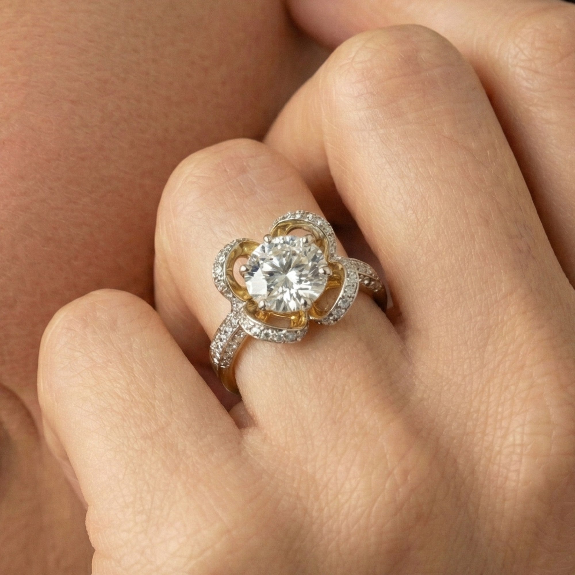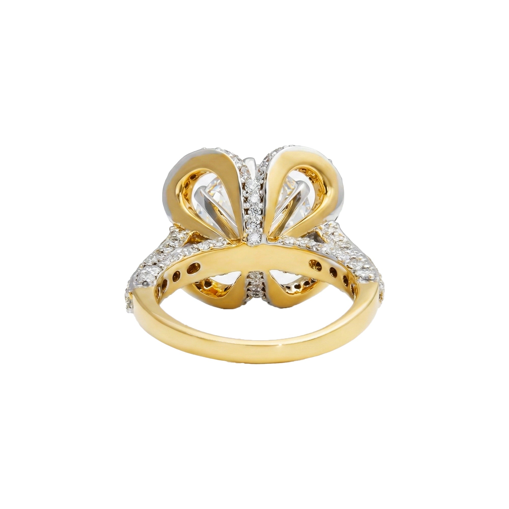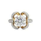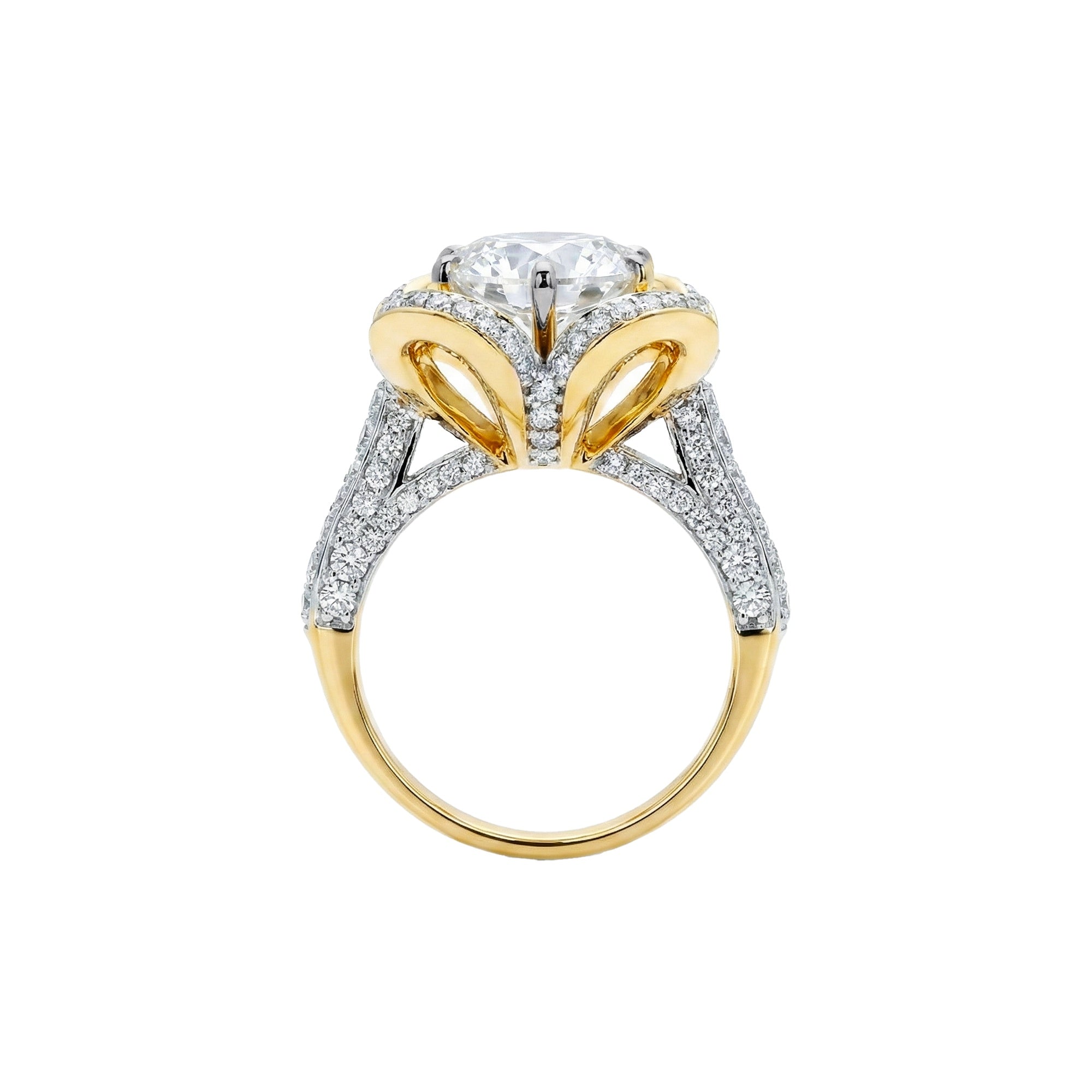 This refined MYZA ring features a stunning 5.11 Carats MYZA IGI Certified (D/VVS2) Lab-Grown Round Diamond Flower Ring in 18K Hallmarked Gold.