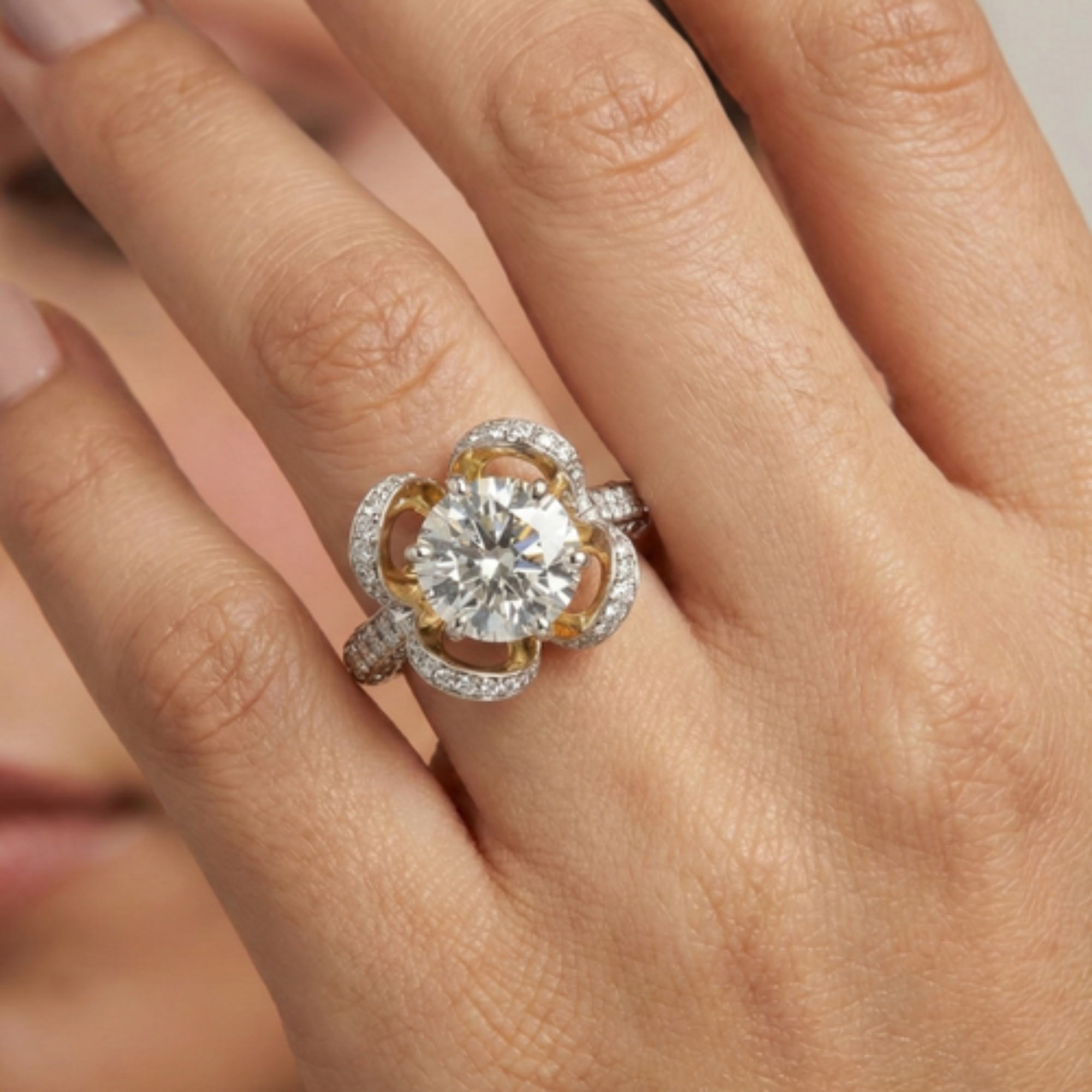 5.11 Carats MYZA IGI Certified (D/VVS2) Lab-Grown Round Diamond Flower Ring in 18K Hallmarked Gold