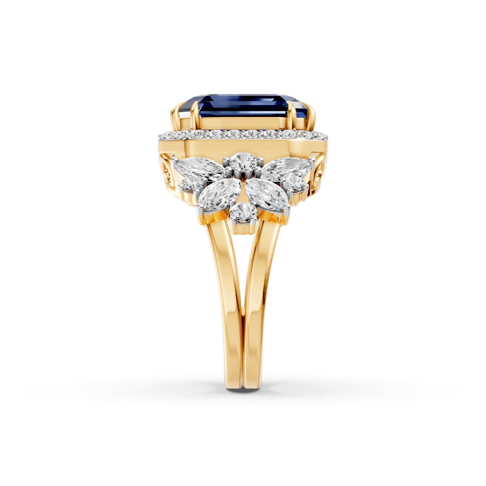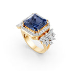 This MYZA Lab-Grown Diamonds & 10 Carats Asscher Cut Sapphire Blue Gemstone Royal Women's Ring features a magnificent lab-grown Sapphire blue gemstone centerpiece encircled by a brilliant diamond halo and flanked by exquisite marquise diamond floral clusters, all set in premium 14K hallmarked gold.