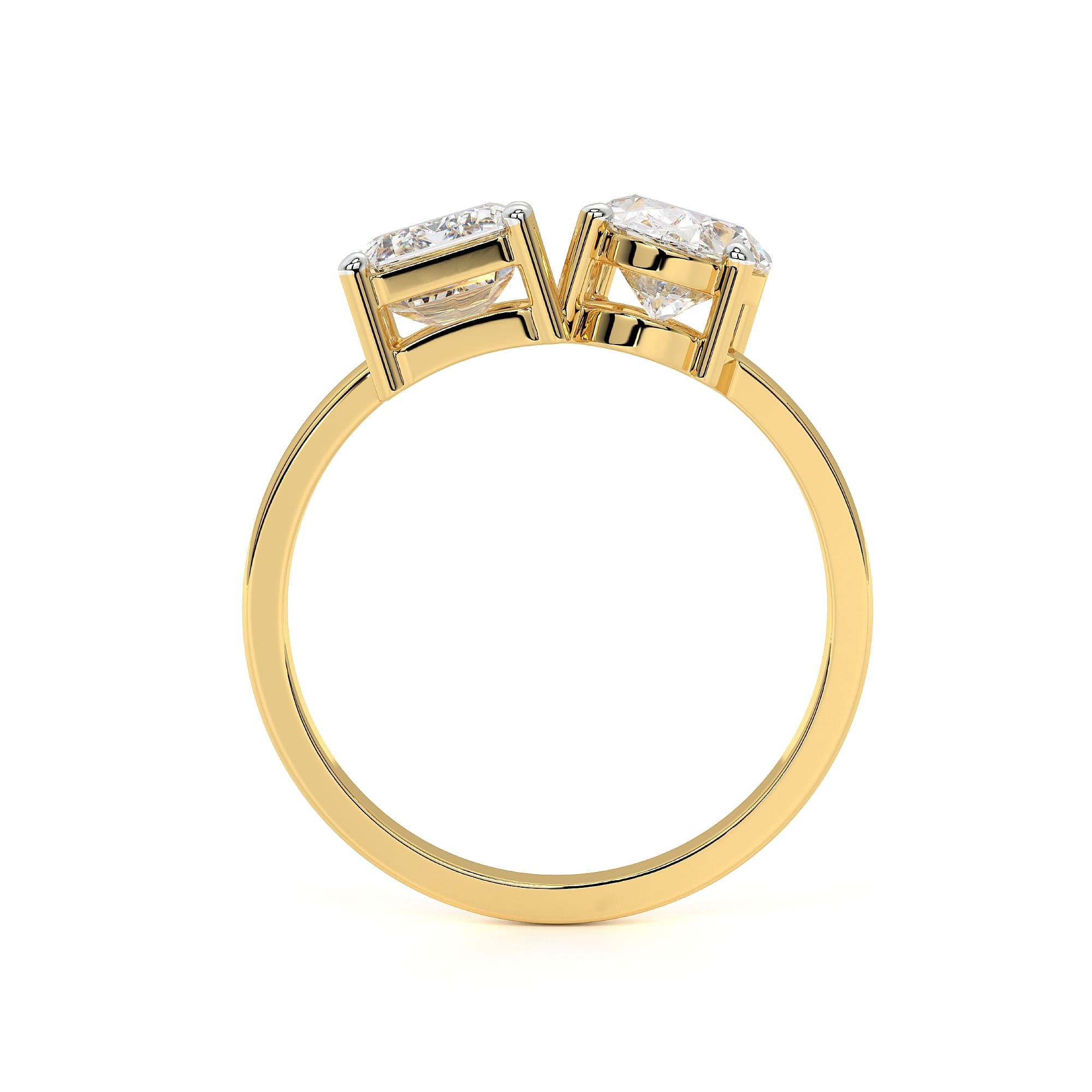Introducing the exquisite MYZA Toi et Moi 2.5 Carat Emerald & Oval Diamond Ring featuring IGI-certified lab-grown diamond, meticulously set in 18K hallmark yellow gold.