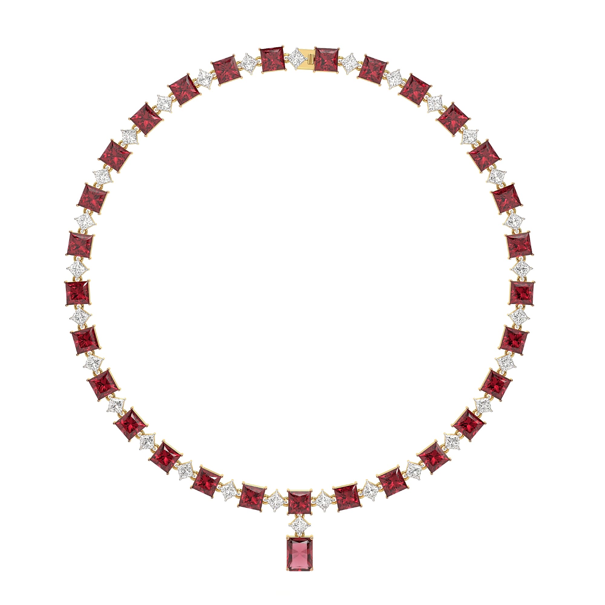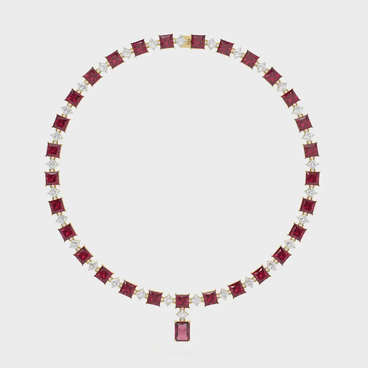 MYZA IGI Certified Princess Cut Lab-Grown Ruby Gemstone & Diamonds Necklace in 18K Hallmark Gold