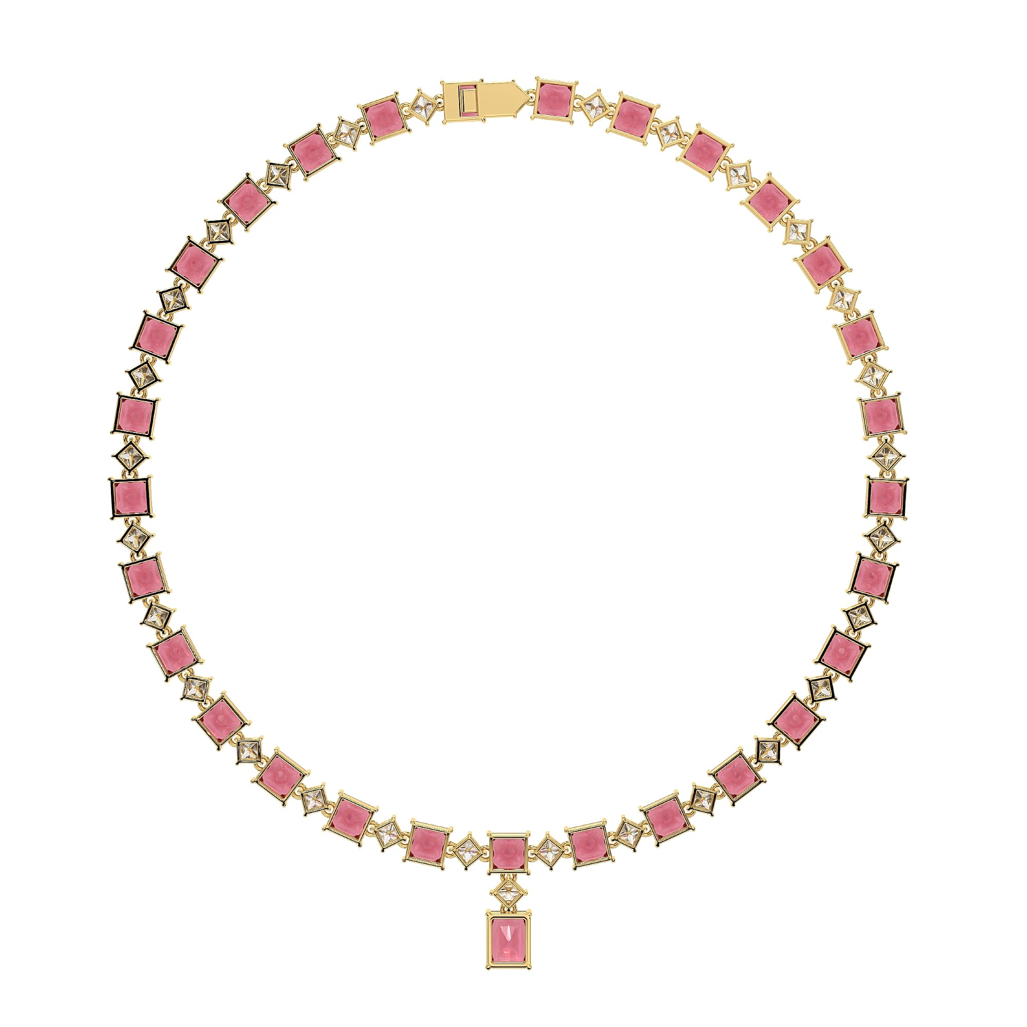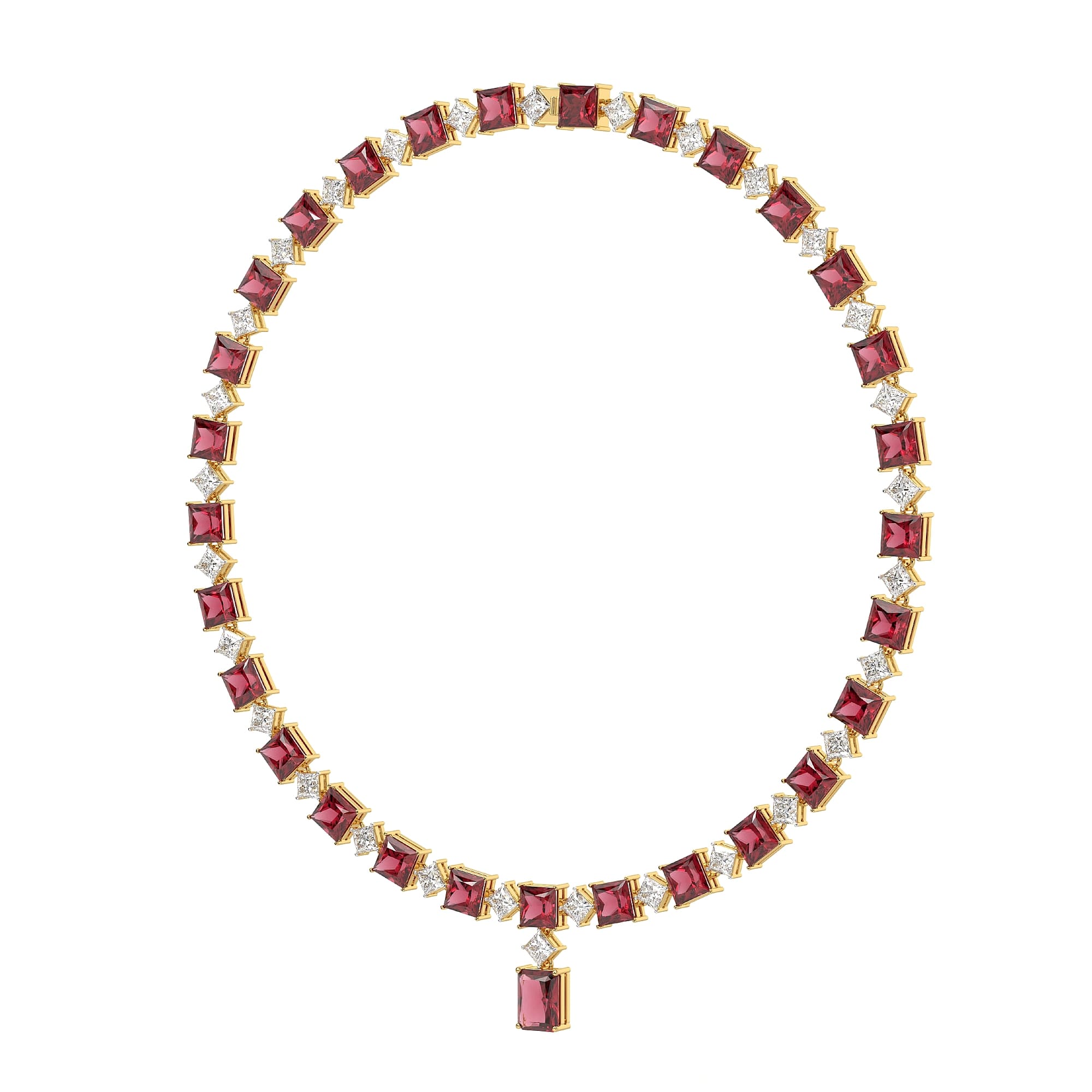This MYZA Princess Cut Lab-Grown Ruby Gemstone & Diamonds Necklace, IGI-certified, crafted in 18K hallmarked gold, designed to shine effortlessly.
