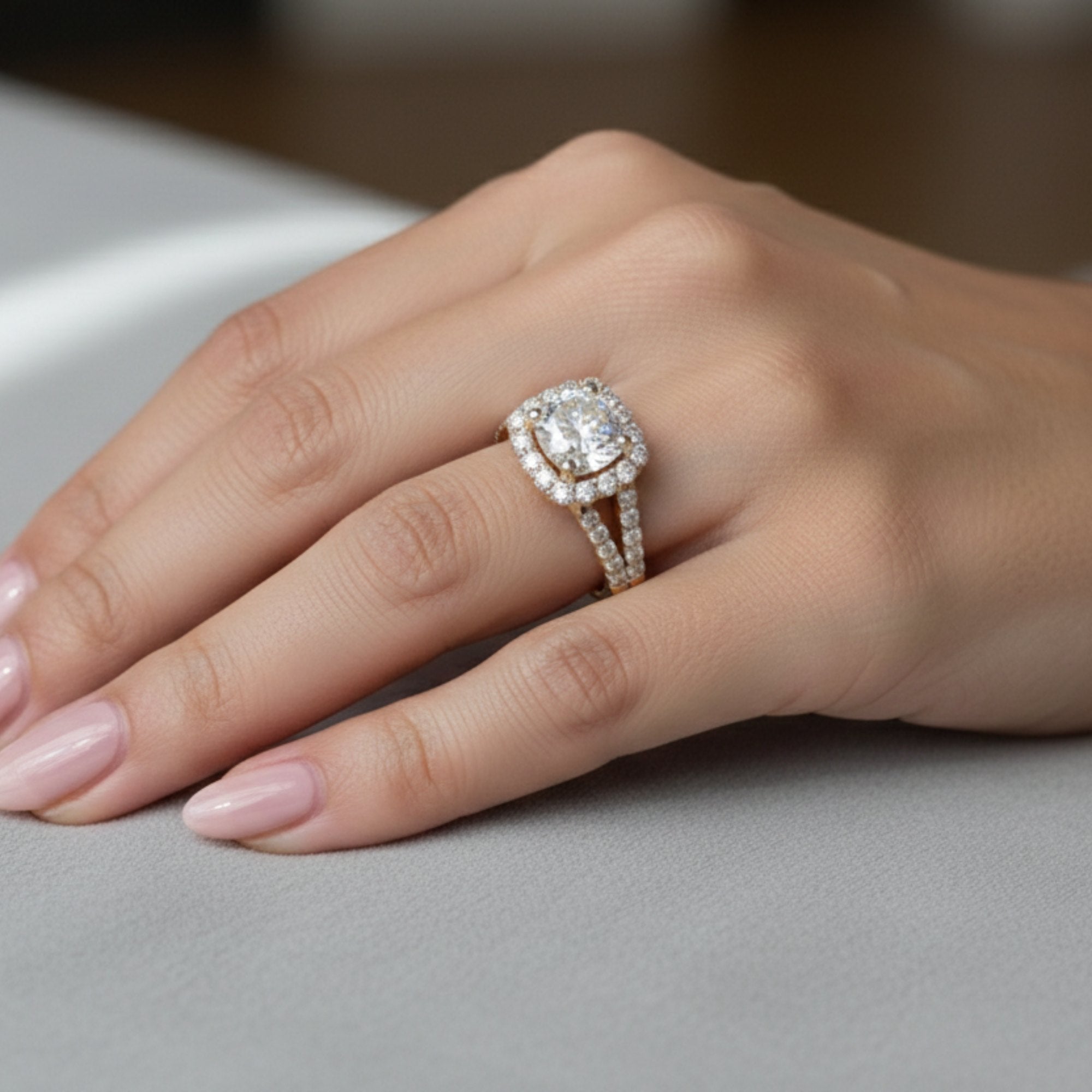 - Brides who desire a high-impact, romantic look, combining the elegant Halo Split Shank Ring design with IGI Certified D/VVS2 precision for an elite engagement choice.